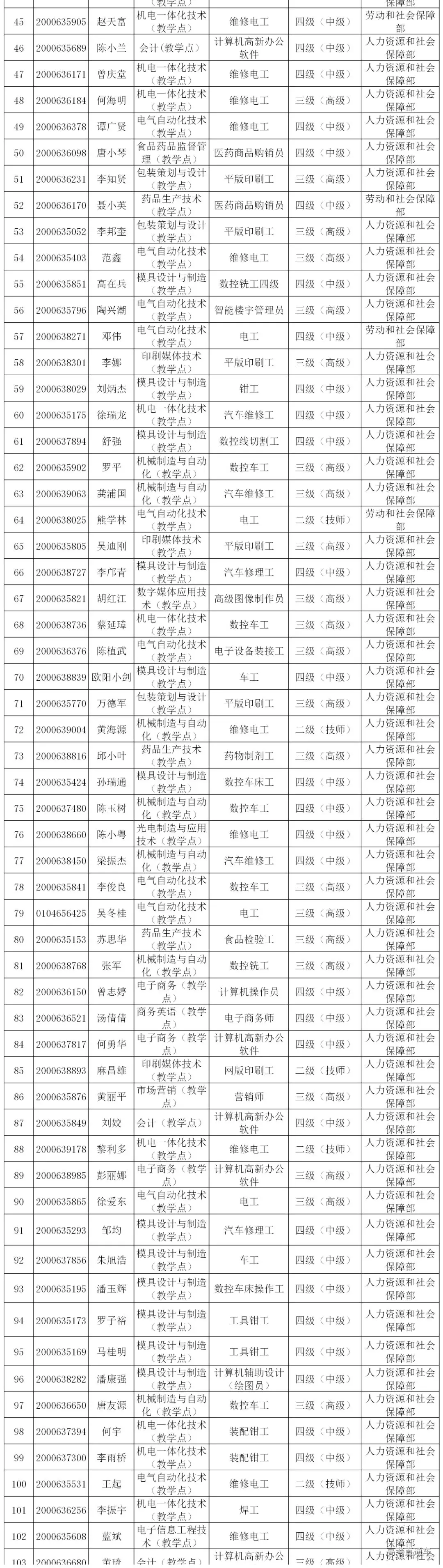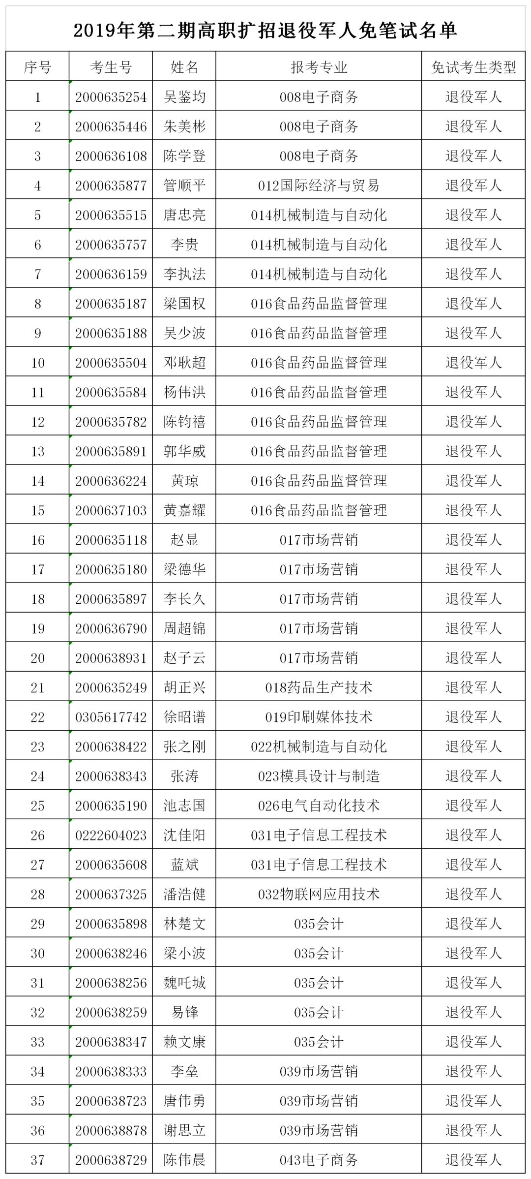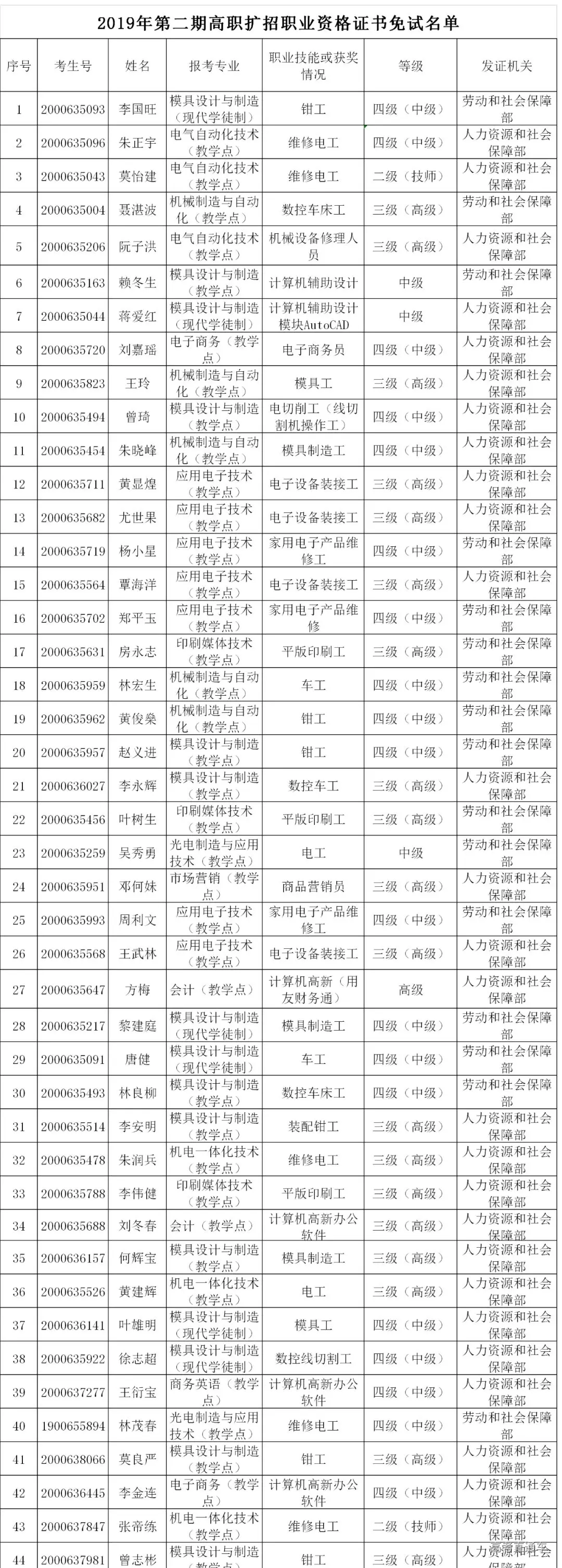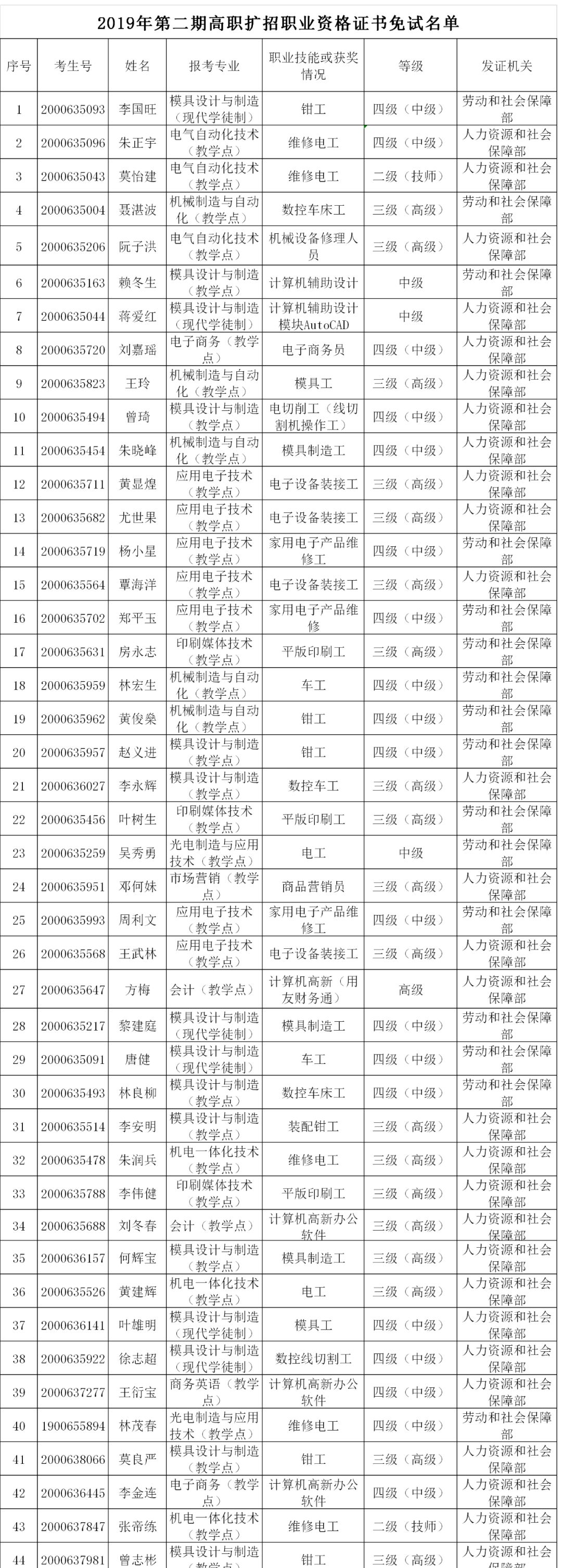 根据教育部等六部委印发的《高职扩招专项工作实施方案》(教职成〔2019〕12号)、《教育部办公厅关于做好2019年高职扩招专项考试招生工作的通知》(教学厅〔2019〕6号)、广东省教育厅印发的《广东省教育厅关于做好2019年第二期高职扩招专项行动有关工作的通知》取得与所报考的招生专业相关的中级以上职业资格技能等级中级以上证书的考生,经考生申请学校资格核实,符合免试入学及退伍军人免笔试名单公示如下:
