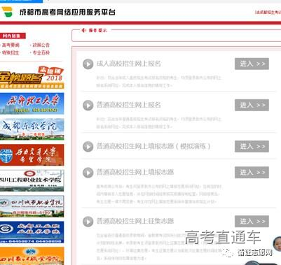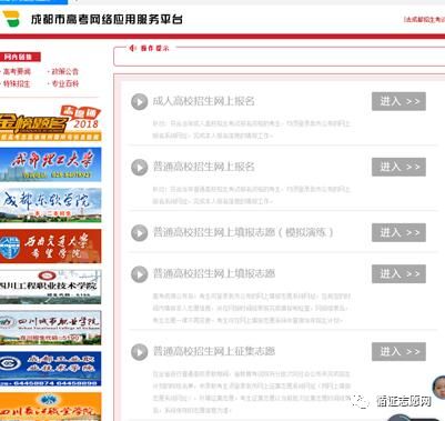 成都市高考网络应用服务平台:http://gkzx.cdzk.net/(成都考生的高考报名、模拟志愿填报、志愿填报、征集志愿填报都将在这个平台完成)