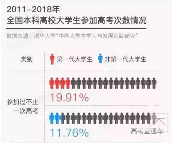 2011-2018年,全国本科大学里第一代大学生(即特指父母没有读过大学、通过自己的不懈努力进入大学的学生)一直保持在70%以上的占比。同时,与非第一代大学生相比,更多的第一代大学生参加过多次高考(即复读),占比达到19.91%。