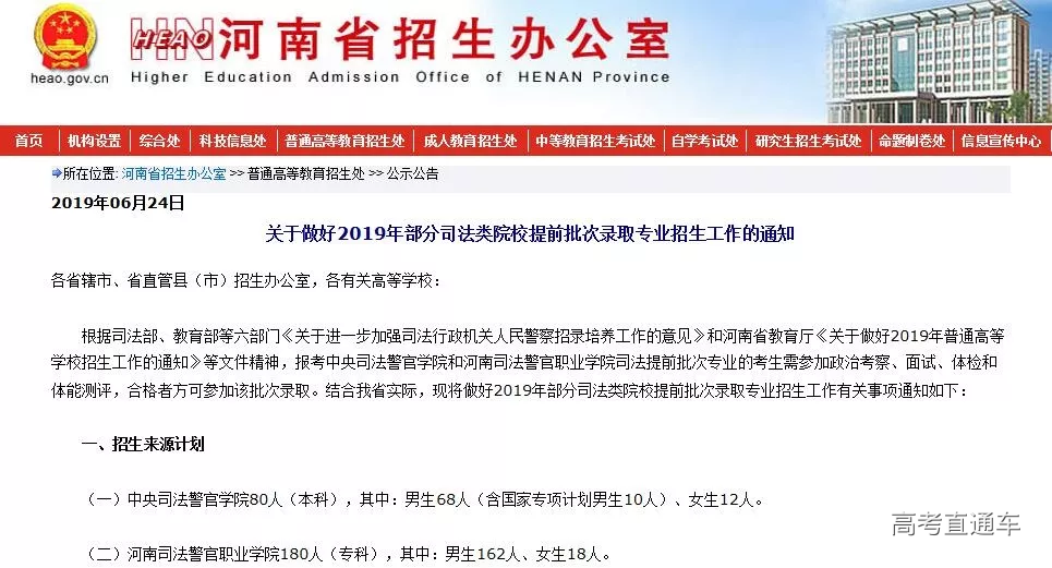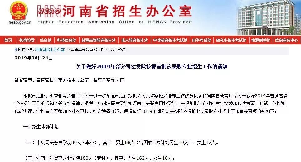 根据司法部、教育部等六部门《关于进一步加强司法行政机关人民警察招录培养工作的意见》和河南省教育厅《关于做好2019年普通高等学校招生工作的通知》等文件精神,报考中央司法警官学院和河南司法警官职业学院司法提前批次专业的考生需参加政治考察、面试、体检和体能测评,合格者方可参加该批次录取。结合我省实际,现将做好2019年部分司法类院校提前批次录取专业招生工作有关事项通知如下: