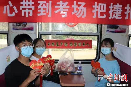 高考车厢内,悬挂着“祝各位参考学子金榜题名”“将信心带到考场把捷报送回家中”的横幅,车窗上也贴上了“不敢高声语恐惊读书人”的醒目标语,列车工作人员向考生送上高考祝福卡。