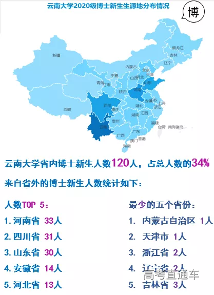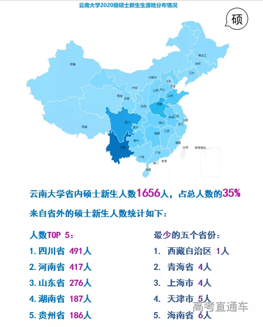 不平凡的金秋九月, 云大迎来了同样不平凡的2020级研究新生。 新的云大故事,将由你们书写! 本届新生, 共有硕士生4718名,博士生342名 大家是不是和团团一样好奇, 他们年龄有几,都来自何地。 下面就让我们一起来看看, 云大2020级研究生萌新大数据! 2020级的大家来自五湖四海, 最终相聚于一个学院、一个专业、一个班级。 快来看看有多少和你志同道合的小伙伴们吧~生源地