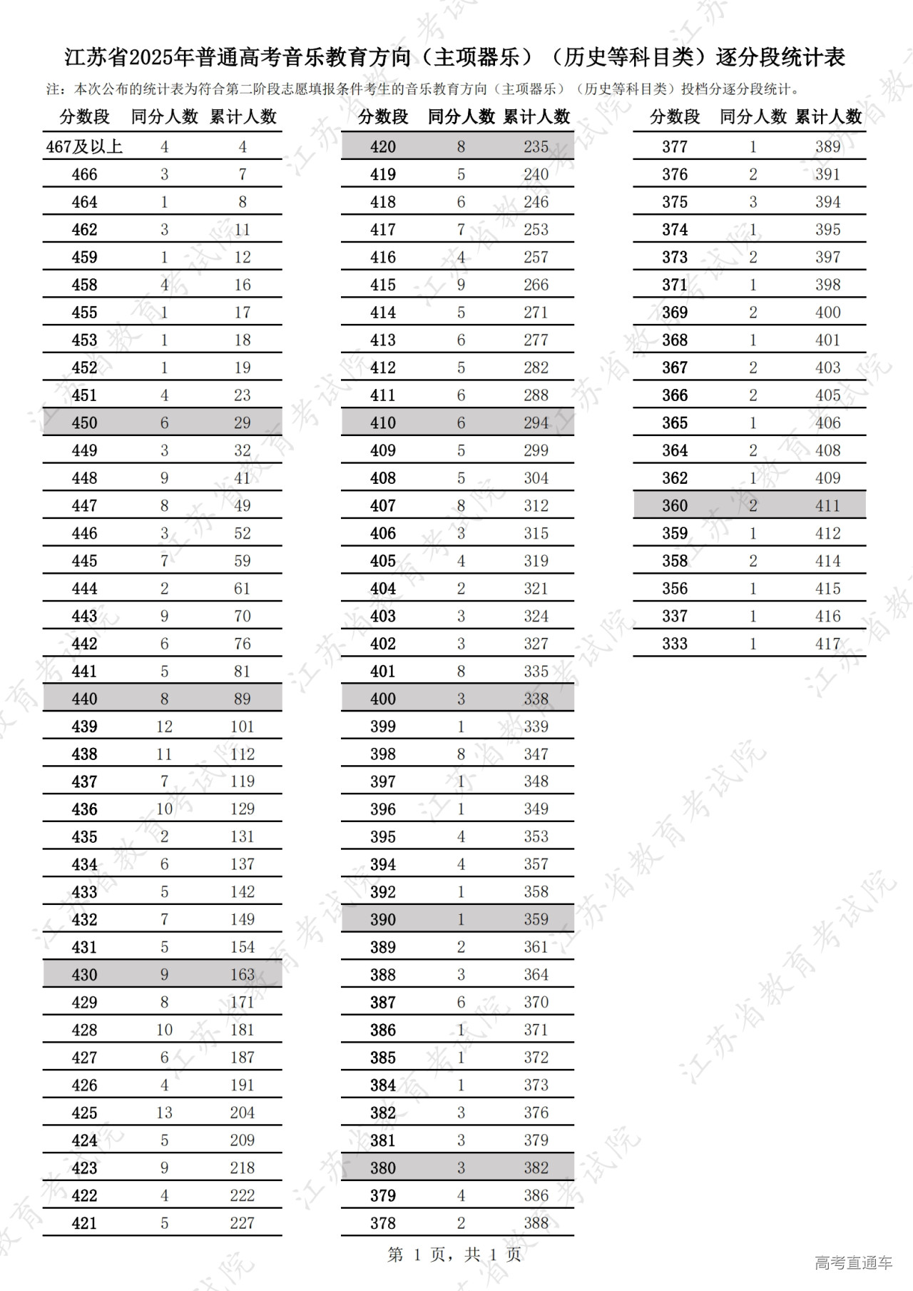 江苏2025普通高考第二阶段逐分段统计表(音乐教育方向(主项器乐)历史)