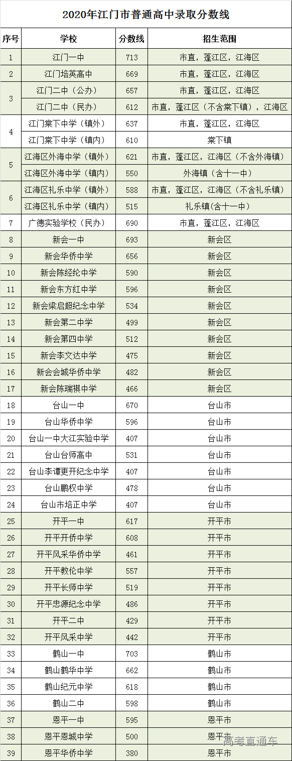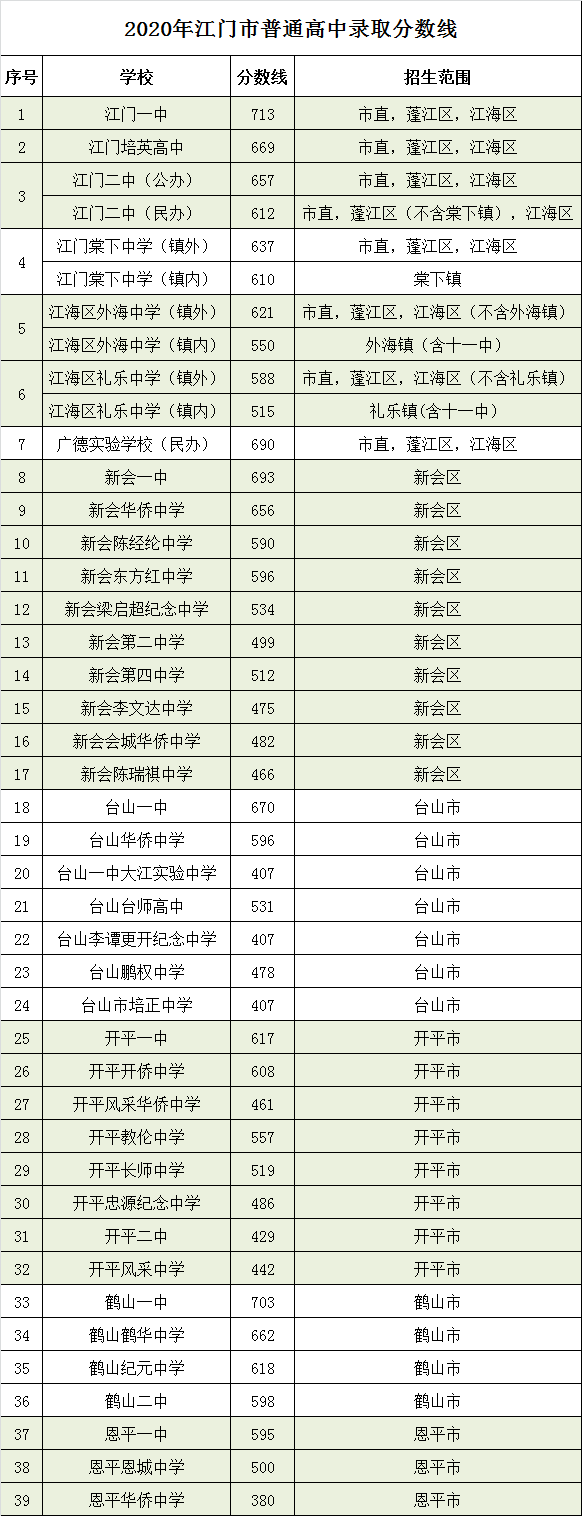景贤学校:3名考生被屏蔽,此前共有136名考生(含体艺保送生14人)被推荐入读江门一中,其中进入江门一中创新班的有31人。 江门市第二中学:2名考生被屏蔽成绩,共209人上江门一中分数线(含推荐生)。 蓬江区怡福中学:2名考生被屏蔽,共有102人达到江门一中录取分数线(包括推荐生),此前,该校已推荐35名学生入读江门一中。 江门市培英初中:屏蔽生1人,上江门一中分数线的共有35人(含此前24名江门一中推荐生)。 广大附中广德实验学校:11位考生被屏蔽成绩,82人上江门一中分数线。 江门市实验中学:1名考生被屏蔽成绩,此前,该校已推荐37名学生入读江门一中(其中进入江门一中创新班的有3人。) 新会葵城中学:51名考生被屏蔽成绩,435人被推荐至新会一中 开平市金山中学:14名考生被屏蔽。 开平风采华侨中学:1名考生被屏蔽。