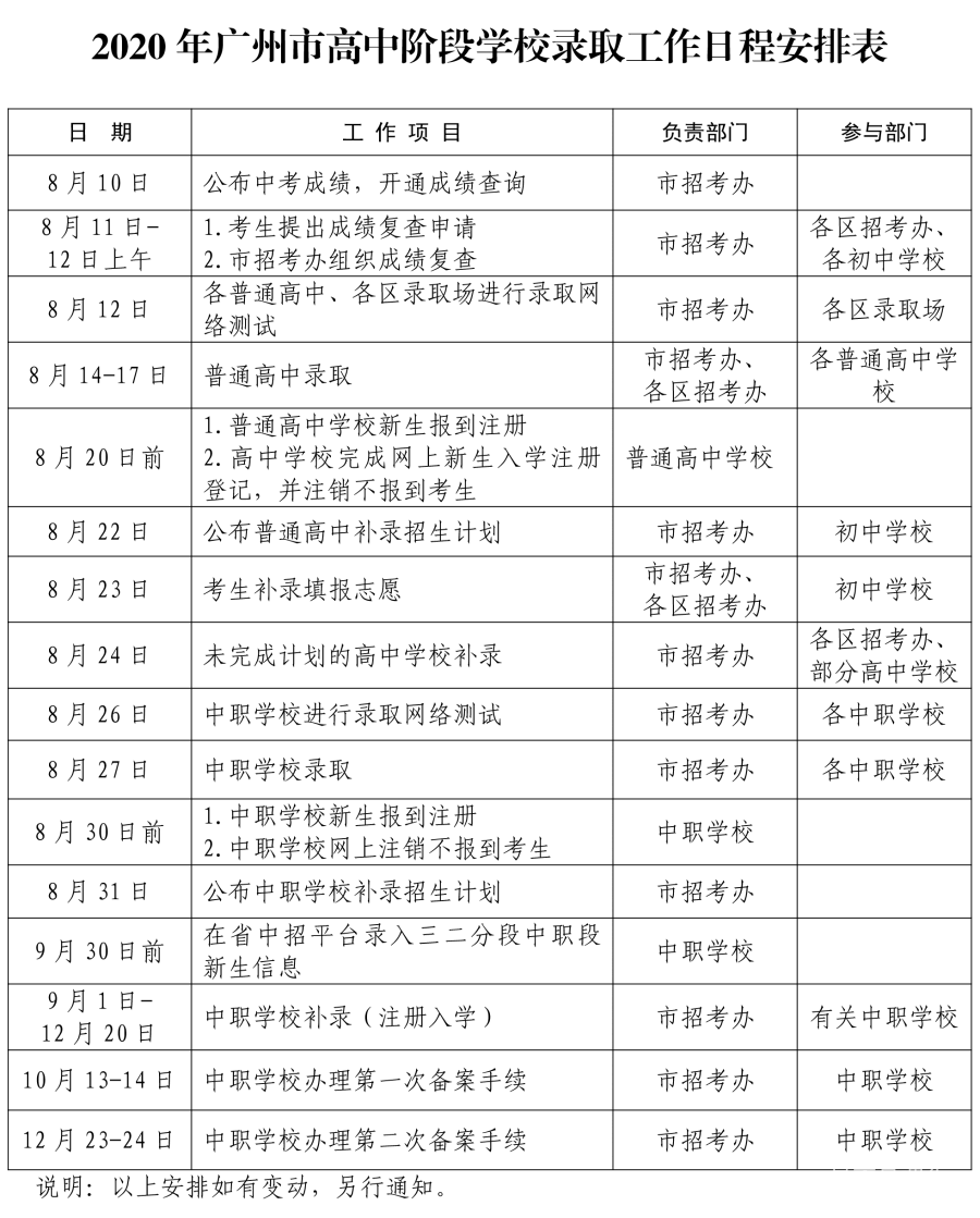 根据《广东省教育厅 广东省人力资源和社会保障厅 广东省招生委员会关于做好2020年全省高中阶段学校招生工作的通知》(粤教职函〔2020〕10号)和《广州市教育局印发<关于2019年至2020年广州市高中阶段学校考试招生的工作意见>的通知》(穗教规字〔2018〕5号)精神,为加强和规范我市高中阶段学校(含普通高中和中职学校)招生录取工作,2020年我市高中阶段学校继续使用广州市中招录取系统开展网上录取工作,实行统一录取平台、统一招生进程、统一组织管理。为确保录取顺利完成,现就有关事项通知如下: