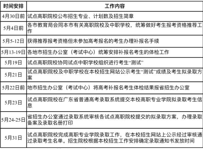 一 招收对象及报考要求 面向办学地点所在地市生源招生(已被“3+证书”、自主招生、三二分段录取的考生除外),须同时具备以下三个条件: 1、符合广东省普通高校招生统一考试报名条件且参加了2019年广东省高考报名的应、往届中职毕业生考生,若尚未取得高考报名号,请于5月5-12日办理高考补报名手续。 2、获得中职毕业学校或地级以上市招生办公室(考试中心)推荐报考资格。 3、学生中职毕业专业与高职招生专业直接相关。 二 招生专业计划及收费标准 (一)住宿费:按肇庆农业学校(肇庆市工程技术学校)、肇庆市工业贸易学校和梅州市职业技术学校住宿费标准收取。 (二)教学地点:分别在肇庆市农业学校(肇庆市工程技术学校)、肇庆市工业贸易学校和梅州市职业技术学校。具体见附表 三 报名时间和方式 (一)报名时间:2019年5月5日至12日 (二)报名地点: 肇庆市考生:到原就读学校招生办或直接到肇庆市农业学校、肇庆市工业贸易学校招生办办理报名手续,现场办理网上报名、确认手续。逾期不再办理报名手续。 梅州市考生:到原就读学校招生办或直接到梅州市职业技术学校招生办办理报名手续,现场办理网上报名、确认手续。逾期不再办理报名手续。 (三)应届生只需携带身份证原件,往届生需携带身份证原件、户口本和毕业证书(原件和复印件)。 (四)获得推荐报考资格但未参加2019年广东省普通高校招生统一考试报名的考生,根据《关于做好2019年广东省普通高考考生补报名工作的通知》(粤招办普〔2019〕27 号)要求,可在5月5-12日期间办理高考补报名手续。 (五)报考办法 采用“推荐+测试”的自主招生录取方式。中职学校应届毕业生由毕业学校推荐,中职学校本省户籍往届毕业生由户籍所在地市级招生办公室(考试中心)推荐,符合随迁子女报考条件的外省户籍中职学校毕业生由居住地所在地市级招生办公室(考试中心)推荐。考生只能报考设置在推荐单位所在地市的高职专业学院,不得跨地市报考。 考生下载《广东工贸职业技术学院2019年高职专业学院自主招生报名表》点击阅读原文前往招生网下载 该表由考生在电脑上如实填写打印出来,只允许填报一个专业志愿。应届生由所在中职学校、往届生由户籍所在招办签署推荐意见并盖章后应届生由所在中职学校、往届生由户籍所在招办签署推荐意见并盖章后连同其他报名材料(见附表2)于5月14日前上交各报名点对接中职学校(对接中职学校汇总交高职学院招生办),报名表扫描件、往届生毕业证扫描件及个人高考报名1寸免冠相片(蓝底)打包压缩文件以“10位考生号+姓名+报考专业+考点”命名于5月14日前发送至我院招办邮箱1037362173@qq.com;申请免试的考生还须将个人获奖证书原件扫描件发送至上述电子邮箱。逾期视为放弃申报资格。 四 考试及考试时间 (一)考试的内容包含文化素质及职业技能,各占50%比例,考试满分值为100分。拟录取考生的考试成绩原则上不低于考试满分值的40%。考试结束后,我校在招生信息网公示考生考试成绩,考生测试成绩公示3天无异议后,我校根据报考考生的专业志愿及考试成绩情况划定各专业最低录取分数线。按考试总分数由高到低择优录取,考试总分数相同时,按职业技能分数由高到低录取。 (二)考试时间:5月19日上午10:00-12:00进行闭卷考试。考试地点分别在肇庆市农业学校(肇庆市工程技术学校)、肇庆市工业贸易学校和梅州市职业技术学校三个考点。届时详见广东工贸职业技术学院自主招生网。 (三)曾获得广东省中等职业学校技能大赛或全国职业院校技能大赛相关赛项三等奖及以上奖项的中职学校学生报考2019年高职专业学院,经我校核实资格并公示后,可免试录取。 (四)无普通高考体检结果或体检不合格者不能被录取。通过高职专业学院录取的学生,不得申请转学及转专业,不得转到我校本部相同专业班级。被2019年高职专业学院录取的学生,不得参加夏季普通高考招生录取。 五 时间安排 (一)录取时间安排 (二)新生注册与复查 经高职专业学院自主招生录取的考生,须在规定时间内办理缴交学费注册。逾期未注册者,取消入学资格。 新生入学后,将对新生进行资格复查。复查后发现在报名和测试过程中有弄虚作假或其他违纪违规行为者,将按规定取消其入学资格。 六 信息公开公示 我校在5月31日前完成高职专业学院自主招生录取工作,将省招生委员会办公室核准备案后的录取名单在学校招生办网站上公示。我校公示考生录取专业等信息,公示信息自公示之日起保留半年。 七 毕业证的发放 八 学校招生工作的监督及申诉