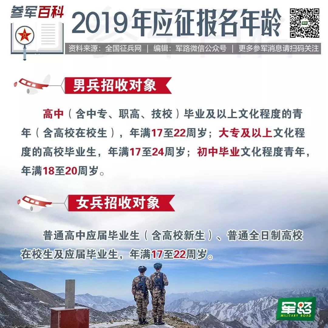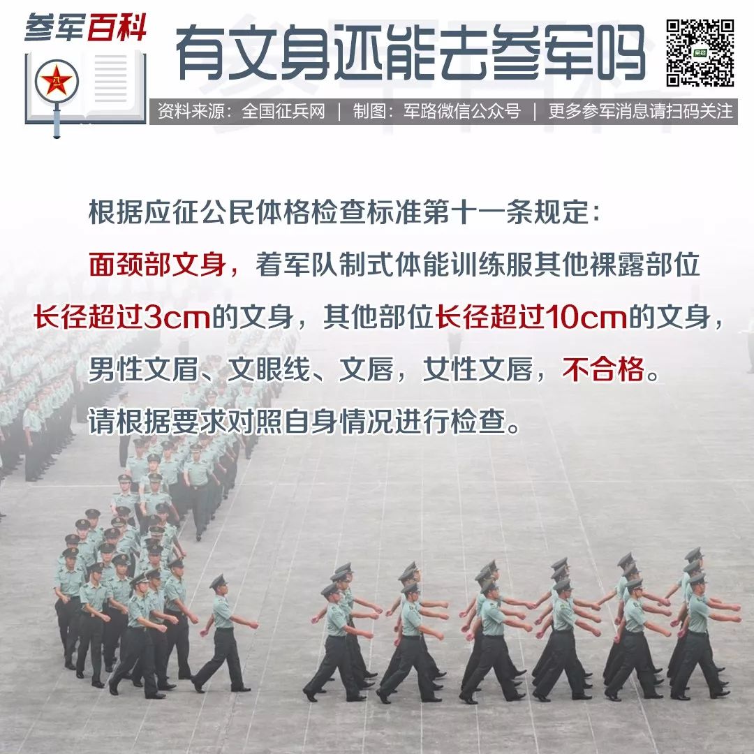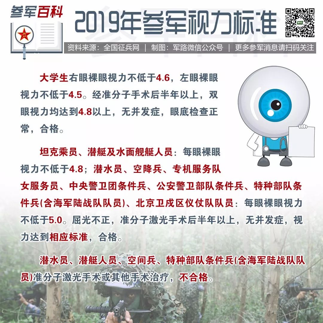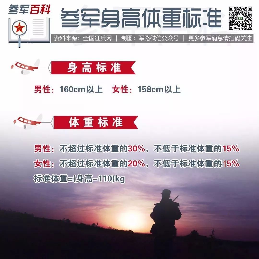2019年征兵时间已经敲定! 年满18岁的男同胞 从今年1月10日起到8月5日 登陆全国征兵网 http://www.gfbzb.gov.cn 即可报名 你和部队的距离 就是那一个鼠标 男兵身高必须要达到160cm 女兵必须达到158cm 体重的算法是 标准体重=(身高减去110)kg 可能有同学有点蒙 举个例子 假如小军的身高是170cm 减去110,等于60 那么60kg则是他的标准体重 参照男兵体重标准 上不超过30%(超过78kg不合格) 下不低于15%(低于51kg不合格) 视力部分一直是很多 00后的困扰 具体的规定是 大学生右眼裸视不低于4.6 左眼裸视不低于4.5 激光手术需要半年以后才算合格 并且双眼视力都需要达到4.8 特殊兵种 比如:特种兵、海军陆战队等等 是不能进行激光手术的 我军对军人文身有严格规定 以前实行一“文”否定 不过现在放宽了一些 根据现行规定 在穿着军装时,能显露出的文身 不能超过3cm 其余部位显露不能超过10cm 男性文眉、文眼线、文唇 也是不合格![]()