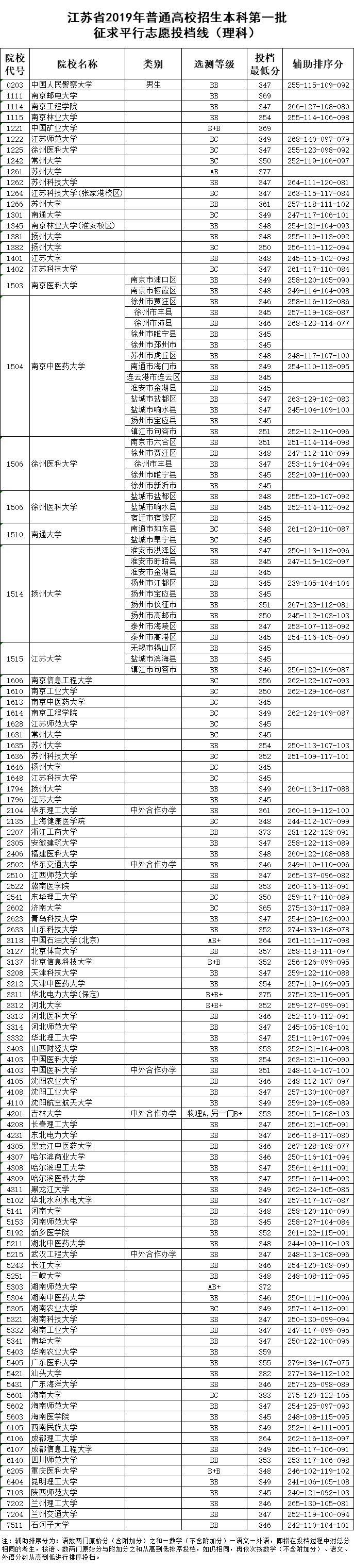 江苏省2019年普通高校招生本科第一批征求平行志愿投档线(理科)