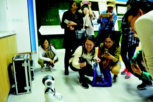◥5月18日,本报走进山大青岛校区,在机器人实验室,学生和家长正好奇地围着机器人NAO拍照。
