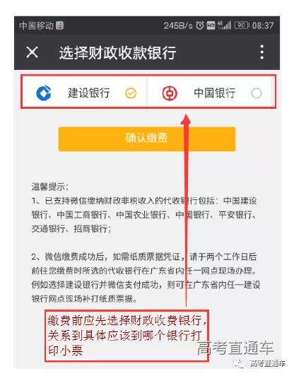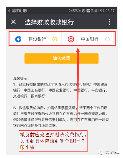 3.在选择收款银行时,如果后续需要打印小票,则按需选择离自己最近的一家银行即可。如果不需要小票,则可以任意选择: