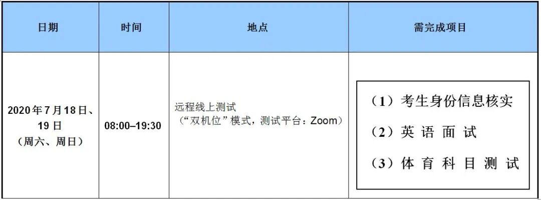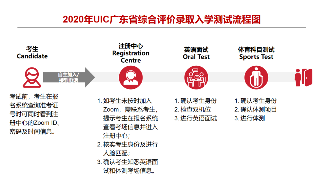 二、注意事项 1、考生身份信息核实 1.1 已获安排参加线上入学测试的学生,请备好有效身份证,于指定日期、时间参加线上入学测试,逾时不候(入学测试流程图见附件一)。考生入学测试日期和时间、注册中心Zoom会议ID和密码,可提前于7月15日起在学校综合评价报名系统中查知。 1.2 考生身份信息核实、英语面试、体育科目测试均使用Zoom软件。考生需提前下载安装并熟悉其使用方法。下载安装地址:https://www.zoom.edu.cn。 1.3 考生于指定的入学测试时间,持个人有效身份证登录注册中心Zoom会议ID,并将将个人Zoom账号名字设置为“姓名+身份证号”的格式,如“陈大文44****************”。学校老师将(a) 进行远程线上核实考生身份信息;(b) 考生身份信息核实无误的,学校老师向考生提供英语面试Zoom会议ID及密码、体育科目测试Zoom会议ID及密码;(c) 考生先进行英语面试;(d) 考生后进行体育科目测试。 1.4 考生身份信息核实环节将采用人脸识别技术。考生身份验证核查期间和考试期间,中途不得离场,请保持手机通讯及考场网络畅通。学校将对身份验证及测试全过程进行录音录像存档。 2、英语面试 2.1 考生使用“双机位”模式参加英语面试,需提前准备好网络远程线上测试所需软硬件等,考生需要按学校规定的时间完成“双机位”软硬件测试,确保设备功能、考试环境等满足学校要求。“双机位”软硬件测试日期:7月9日至13日9:30-17:30,方式:Zoom网络远程测试。请考生留意学校招生办公室通知。考生如未参加“双机位”模式网络远程测试,或测试未达到要求的,由此产生的对入学测试的一切后果由考生自行承担。关于“双机位”模式考试环境、设备及技术要求,请详见2.2和2.3。 2.2 考试环境 2.2.1 良好稳定的网络环境,建议有线网络、Wi-Fi、4G或5G中准备2种及以上,优先使用有线网络。 2.2.2 在家中安静、独立、可封闭的房间,灯光明亮,不逆光。禁止在公园、网吧、餐厅等公共场所进行考试。除考生外不允许有其他任何人在场,也不允许出现其他声音。不得由他人替考,也不得接受他人或机构以任何方式助考。测试期间视频背景必须是真实环境,不允许使用虚拟背景、更换视频背景。 2.2.3 统一穿校服或运动服参加测试。电脑和键盘必须放在桌子上,桌面和周围区域必须清除其他物品。考试期间不允许进食。 2.3 设备及技术要求 2.3.1 支持“双机位”模式的软硬件,包括2部带摄像头的设备,支持高清视频通话的电脑或智能手机均可。第一机位设备摆放于考生正面,登录英语面试Zoom会议ID,尽量使用电脑;第二机位设备摆放于考生侧后方45°,同时登录英语面试Zoom会议ID,保证视频呈现考生和第一机位的屏幕图像,可使用电脑或手机。电脑操作系统建议为 Windows8 及以上版本。不开启任何无关程序。确保设备电量充足。 2.3.2 考生测试时音频视频必须全程开启,全程正面免冠朝向第一机位摄像头,坐姿端正,双手平放于桌面,保证头肩部出现在视频画面正中间。不得佩戴口罩,保证面部清晰可见,素颜,测试过程中不开启美颜等功能,不允许采用任何方式变声、更改人像。不戴饰品,不得使用有线或无线耳机,不得佩戴智能手表、智能眼镜等智能产品,头发不得遮挡面部,露出双耳。测试全程考生应保持注视摄像头,视线不得离开。 2.3.3 英语面试前,摄像头必须能够移动,向监考官展示你360度的房间全景,包括你的桌面。 “双机位”模式如下图: 第一机位示例图 第二机位示例图 “双机位”示例图 “双机位”摆放要求视频 3、英语面试前,考生应详细阅读学校《Oral Examination 2020- Instructions to Candidates》(见附件二) 4、体育科目测试 4.1 考生登录体育科目测试Zoom会议ID进行测试。测试前,考生应详细阅读学校《2020年广东省综合评价录取体育科目测试要求及规则》(见附件三),知晓各测试项目对本人身体带来的潜在风险并做好充分准备。考生统一穿校服或运动服参加测试,并在测试过程中注意安全。 4.2 考试期间需完全入镜,不得有遮挡或出镜部分。如选择一分钟跳绳,测试时须连同器材完整出现在视频内,建议选择跳绳的考生距离设备镜头2-3米。 4.3 考试期间保持考试场地安静,避免影响考试。如在考试期间有其他人员进入到视频内,则视为考试无效。 4.4 体育科目测试结果不计入综合评价入学测试总成绩,将作为录取时的重要参考。 4.5 体育测试原则上不受理考试项目更改或缓考申请。若考生确因生理疾病或意外伤害等特殊情况无法参加原选定项目的,须在考核前3个工作日提出申请并附上相关证明(三甲医院证明、身份证正反面复印件等),发邮件至admission@uic.edu.cn,经学校审核同意后方可更改考试项目或缓考。 5、其他注意事项 5.1 测试期间,考生应严格遵守考场规则,全程不得录屏录像录音,不得外传泄题,不得以任何方式查阅资料。凡是违反考场纪律和替考作弊的,一律取消入学测试资格不予录取. 5.2 如遇特殊不可预见情况(如台风橙色或暴雨红色预警信号),将另行通知。 5.3 我校并无组织任何综合评价录取入学测试培训,也从未授权任何个人或机构以任何形式开展此类考前辅导或培训,请家长和考生们谨防误导或受骗。 5.4 如上级政府部门更改政策,我校将作相应调整并及时公布。 5.5 学校考试服务热线:7月18日至19日入学测试期间,考生如有问题可联系学校考试服务热线:0756-3620011,3620022,3677041,36770