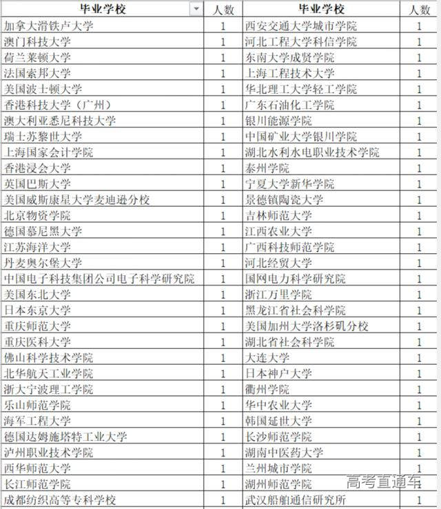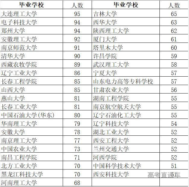 录用人数在50-100人之间的高校41所,大连理工大学95人,电子科技大学、郑州大学各94人,中国科学技术大学51人。