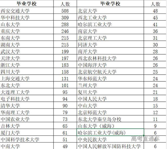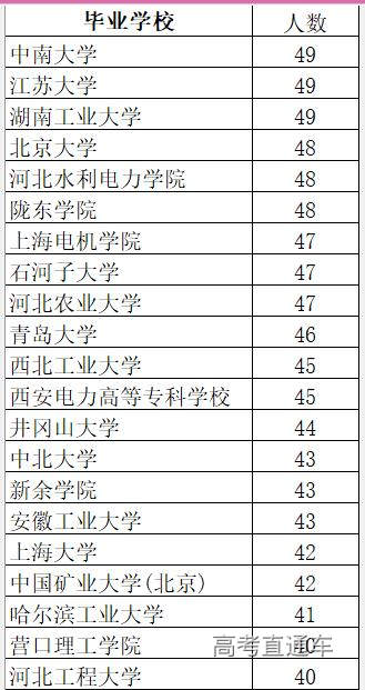 录用40人到50人之间的高校21所,中南大学、江苏大学、湖南工业大学各49人,北京大学48人,西北工业大学45人,哈尔滨工业大学41人。