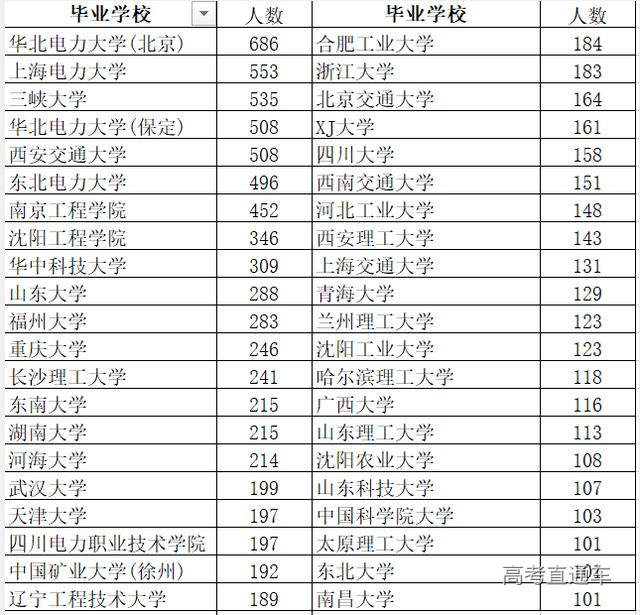 录用100人以上的高校42所。毫无悬念华北电力大学拔得头筹,北京校区录用686人,保定校区录用508人,另外还有2人未指明校区,一共1196人。第二位上海电力大学553人,三峡大学535人位列第三。西安交通大学508人,东北电力大学496人,南京工程学院452人,沈阳工程学院346人,华中科技大学309人,长沙理工大学241人。东南大学、湖南大学各215人,河海大学214人。专科院校四川电力职业技术学院录用197人。