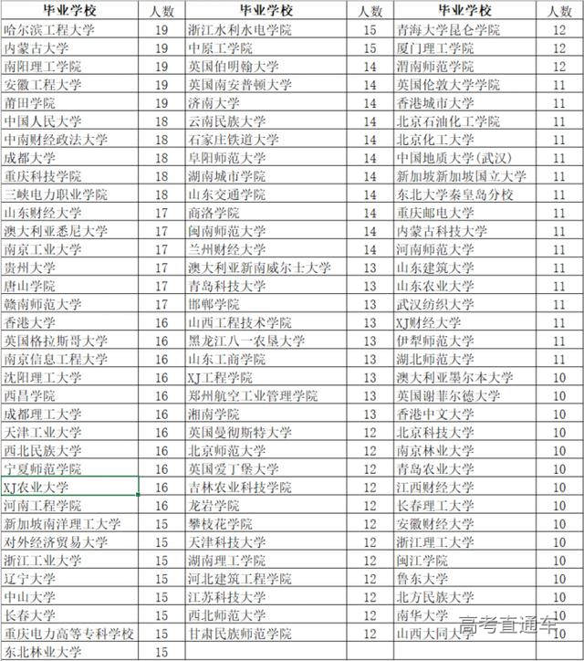 录用10人到20人之间的高校103所,哈尔滨工程大学、内蒙古大学各19人,中国人民大学18人,北京师范大学12人,北京化工大学11人。