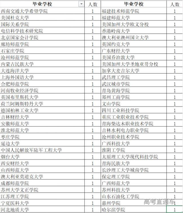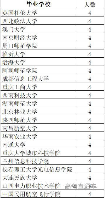录用20人到30人之间的高校65所,南开大学28人,中国海洋大学26人,北京航空航天大学、西南大学各25人,兰州大学24人,复旦大学21人。