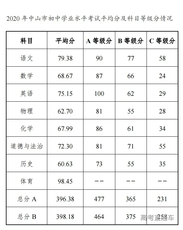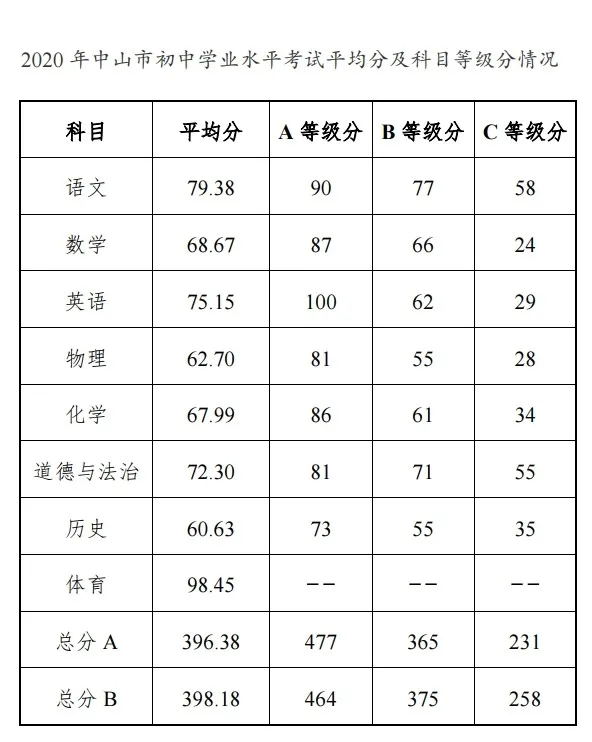 2020年中山市中考成绩