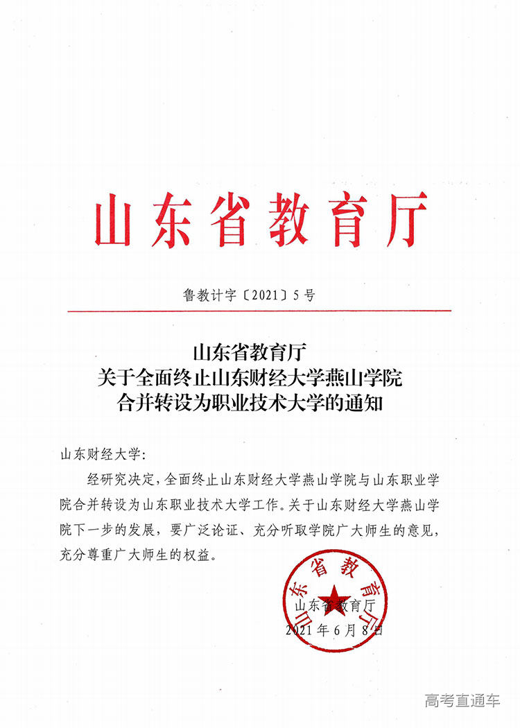 6月8日,山东省教育厅发布《关于全面终止山东财经大学燕山学院合并转设为职业技术大学的通知》。提出,经研究决定,全面终止山东财经大学燕山学院与山东职业学院合并转设为山东职业技术大学工作。