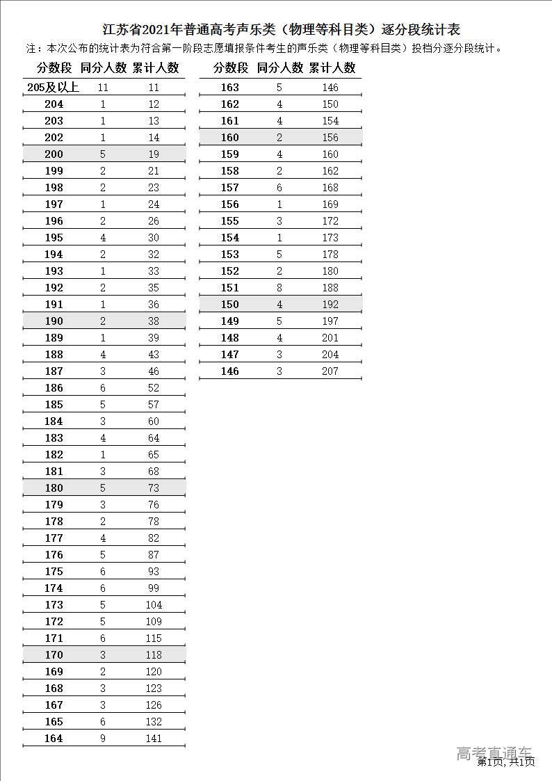 江苏省2021年普通高考声乐类(物理等科目类)逐分段统计表