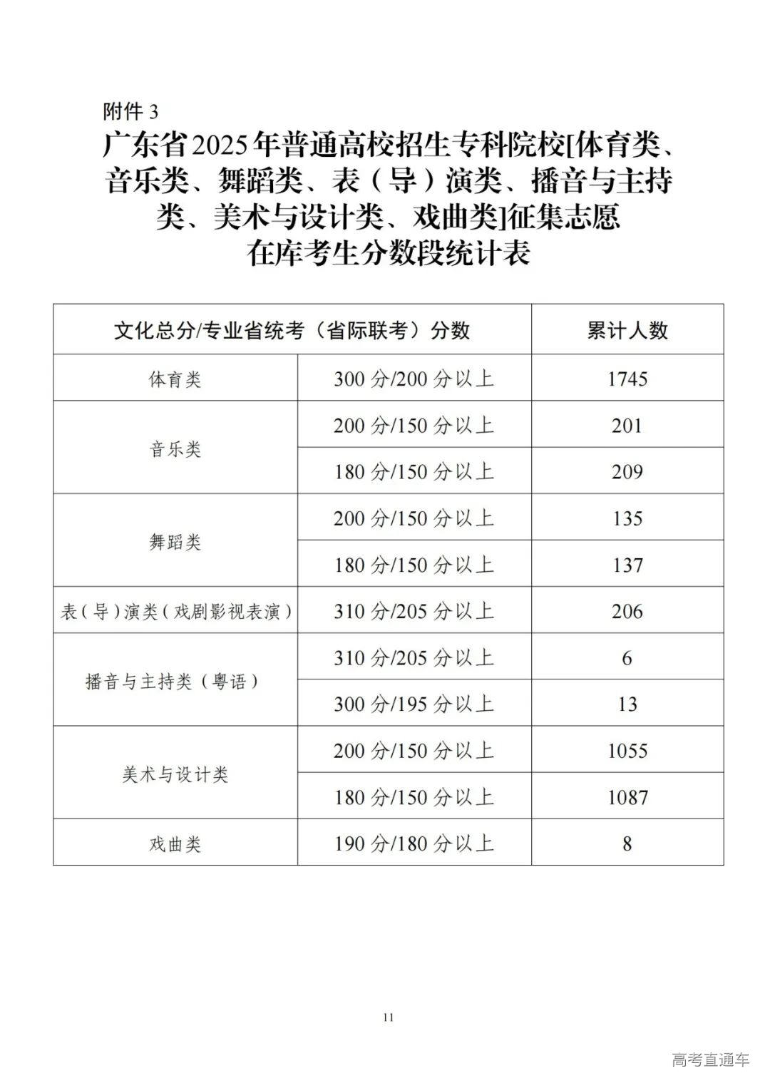 3.广东省2025年普通高校招生专科院校[体育类、音乐类、舞蹈类、表(导)演类、播音与主持类、美术与设计类、戏曲类]征集志愿在库考生分数段统计表