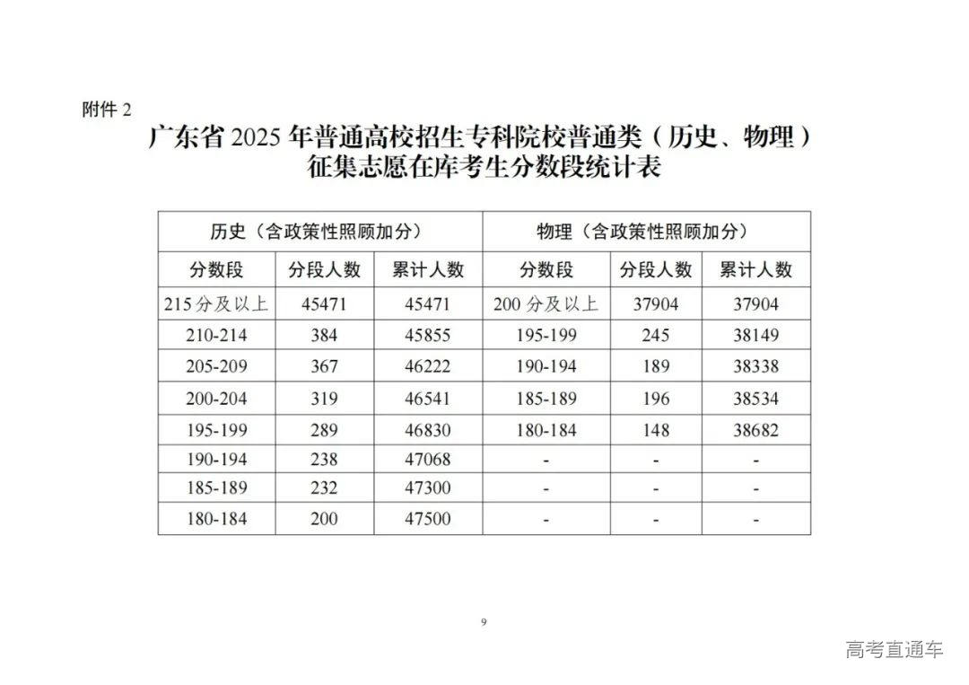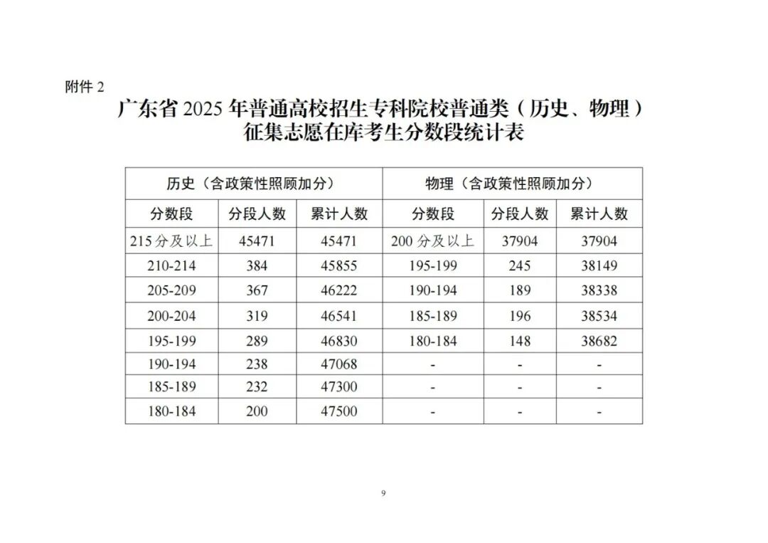 2.广东省2025年普通高校招生专科院校普通类(历史、物理)征集志愿在库考生分数段统计表
