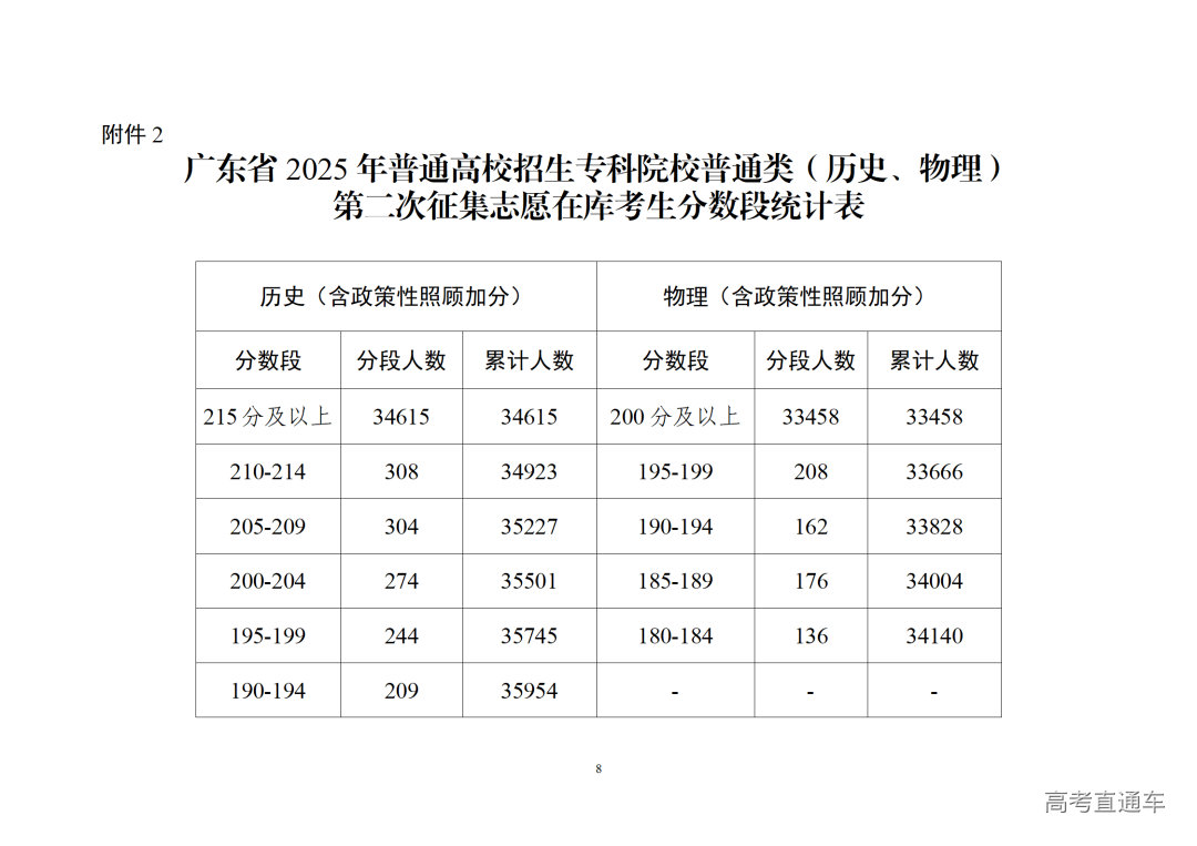 2.广东省2025年普通高校招生专科院校普通类(历史、物理)第二次征集志愿在库考生分数段统计表