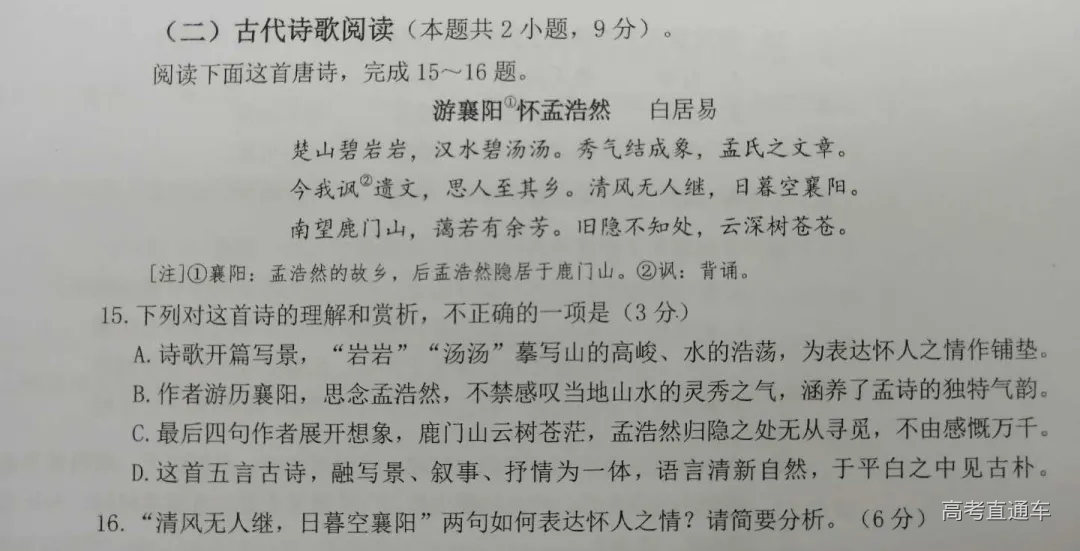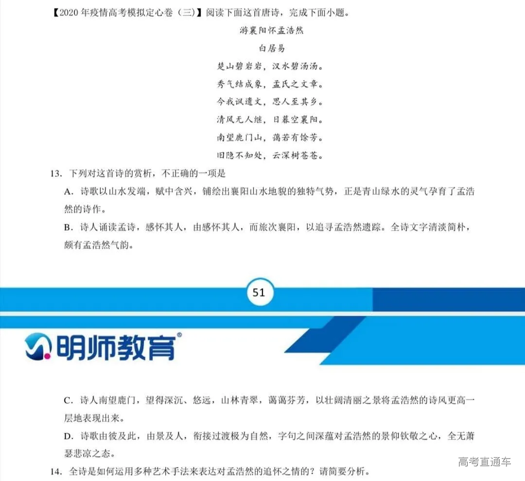 新高考下全市高三第一次统考 这次的语文试卷情况如何呢 明师教育高考研究院带你深度分析 1. 紧密结合时事热点,如“天问一号”等话题;注重中华民族文化的弘扬,如唐诗宋词传统手工艺,考古学等话题。 2. 整张试卷试题结构和题型与2020年全国1卷题型大不相同,将论述类文本非连续性文本相融,而与2020年山东高考卷基本保持一致:文学类文本阅读考查小说阅读,语言运用题延续2020年山东高考的病句修改题,同时,也沿用2020全国1卷的压缩题,作文则贴近高中生学习生活,从面向高一生的成长分享角度切入,引发学生思考。材料中,注重“社会实践”这与新高考的要求一致,要求高中生科技、科研以及创新的重要性、关注中医、传统文化的传承与发展以及对社会、对国家具备应有的关注与担当。 尤其值得注意的是,尽管试卷结构发生较大变动,2019与2020年语言基础题采用的语段式命题,在这次试题依然出现。 3. 难度较2019年的高考和去年的市调研考试都有所增加。论述类文本虽概念易理解,但对分析能力的要求较高,也新增了主观题;小说阅读考查了小说构思和情节安排作用,难度较大;诗歌鉴赏考查对诗歌综合赏析,难度稍大;语言运用题考查病句修改和语段压缩,需要有对不同应用文的文体知识的大量积累。 4. 第4、5、20题为新增加的题型。其中,实用类文本阅读的第4题考查学生的概括分析能力,第5题属于理解性鉴赏分析题,能力要求较高,需要学生在理解文意的基础上进行综合评析。第20题考查语言基础运用,从语段的表达效果间接考查了多种表达技巧,如比喻排比等,同时需要学生关注赏析中有关色彩运用与字词的锤炼。 1. 小说阅读《鱼的故事》第二题指向性非常明确,答出情节构思的作用。第三题抓关键词“‘我’做的梦”,从人物形象、情节、主旨及艺术效果几个角度作答。其中艺术效果角度可答“增添小说的魔幻色彩”。 2. 文言文阅读《晋书·葛洪传》第二问字词理解考查了“国史”,一指国家的史官,二指当代人修纂的本朝实录和本朝历史,后泛指一个朝代的历史。“碑诔”,碑上叙述死者生前事迹并表示哀悼的文字。“江左”,江东,是中国历史的地理概念,属于汉族地区的一部分。指长江以东地区,又称江左,长江在自九江往南京一段(皖江)为西南往东北走向,于是将大江以东的地区称为“江东”。“班马”, 指汉班固与司马迁。 3. 诗歌鉴赏《游襄阳怀孟浩然》第一问考查诗歌鉴赏分析,C选项“最后四句作者展开想象”分析有误,诗歌后四句句描绘的是鹿门山云树苍茫的景象,应该是实写,而非想象。第二问考查对诗歌的综合赏析。解答这类题目,一般需要考生对诗歌知识点考查点有全方位的理解及梳理,从手法、景物意象字词的选用等几个方面加以分析。 语文第一大题是现代文阅读,同学们一看文章信息量大、专业术语多常常产生恐惧感。此处需要强调,不能完全看懂是很正常的现象。此时需要放平心态,用5分钟快速把文章读完,读的过程中要圈画重点句,重要字词,不求理解透彻,但求能够精准定位。阅读完成后,开始审题目和选项,精准定位信息句,细心对比找出不同之处,用排除法做题,通过分析比较得出答案。 做文学类文本阅读,同学们常常苦于需要写的内容太多,但时间不够。此时需要看分答题,6分的主观题一般需要答3-4个点,答题模式一般是结论先行1句+结合文本分析1-2句,能把要点解释清楚即可,大篇幅阐述会非常浪费时间。 对于古诗文阅读的答题角度,大家常常会纠结很久:只是考察情感究竟要答哪些内容?为了保险起见,建议把古诗文涉及的三个得分要点都写上,即诗句翻译、表达技巧及效果、情感,力求答题全面,分析到位。 本次考试中,有同学会出现时间结束但是答卷没有答完的情况,也有同学匆匆写完,感觉答的要点不够到位不够全。大家可以在日常练习用计时器控制时间,提升做题速度和紧迫感。其次,要多总结答题模板和答题技巧,记录在笔记本中,考试前需要集中强化记忆,才能在实际考试中快速联系到相关的答题要点和答题语言。 1. 密切关注时事热点,紧跟时代步伐,培养家国情怀。平时多阅读《读者》、《青年文摘》、《作文素材》、《语文月刊》等杂志类书籍,同时多关注一些时事网站。将时事热点与人文情怀结合起来,力求形成自己独到而又深刻的见解。 2. 精读高中语文教材,提升语文素养。新课标教材本着“文质兼美”的选文标准,包含了丰富而生动的课文内容,生动地体现了语言构建与运用、思维发展与提升、审美鉴赏与创造、文化传承与理解这四大语文核心素养。因此,除了掌握必要的知识技能,还应该用心体会其中的文化内涵与价值情感,还要注意教材之间的相关性,单元主题与课文内容的匹配性,知识点与知识点之间的系统性,而不仅仅是把教材当作一种应试的工具。 3. 加强基础知识的题目训练,梳理知识体系,拓展思维模式。例如现代文阅读中小说的考点包括人物、情节、环境、主旨等,熟练掌握了这些最基本也是最重要的知识点,不仅可以提升做题速率,而且可以开拓思维模式。