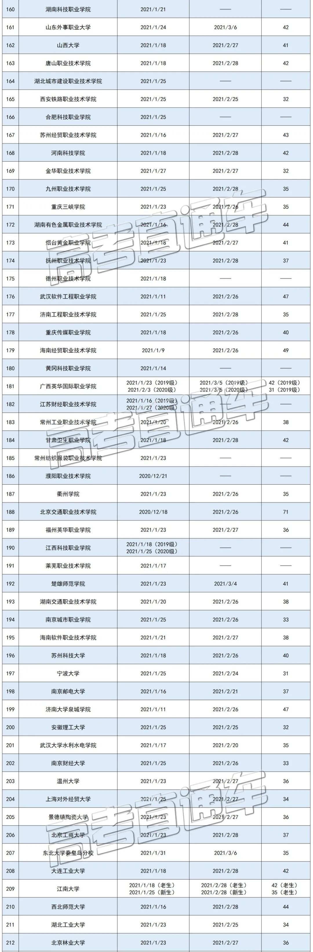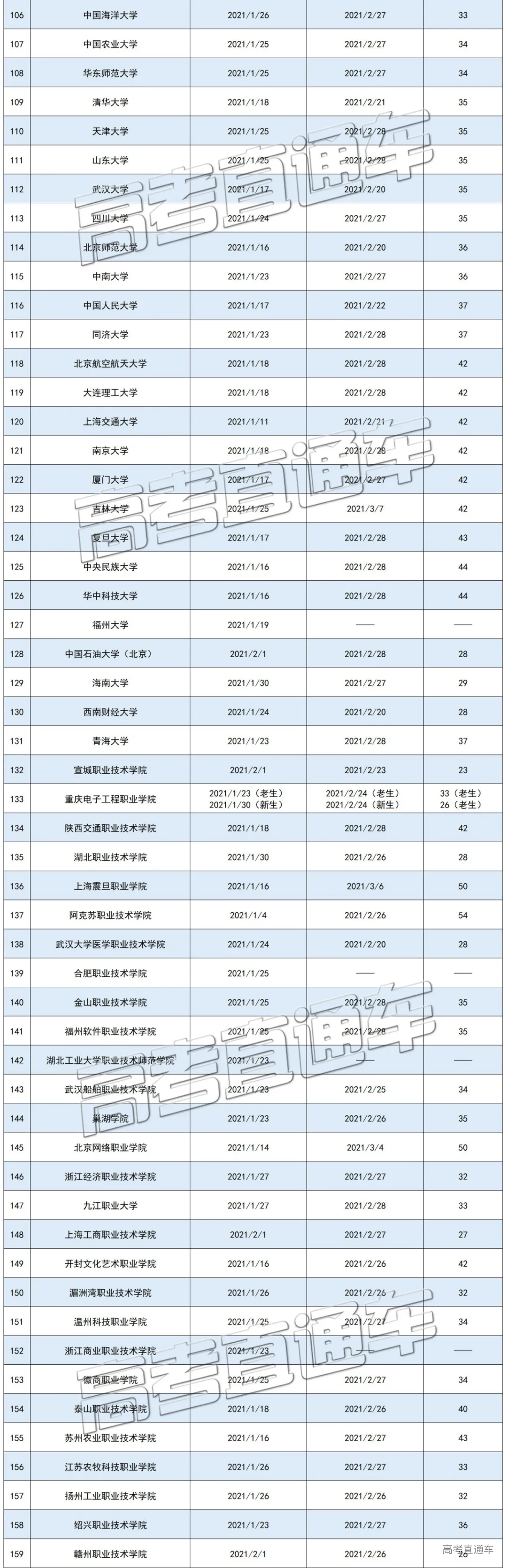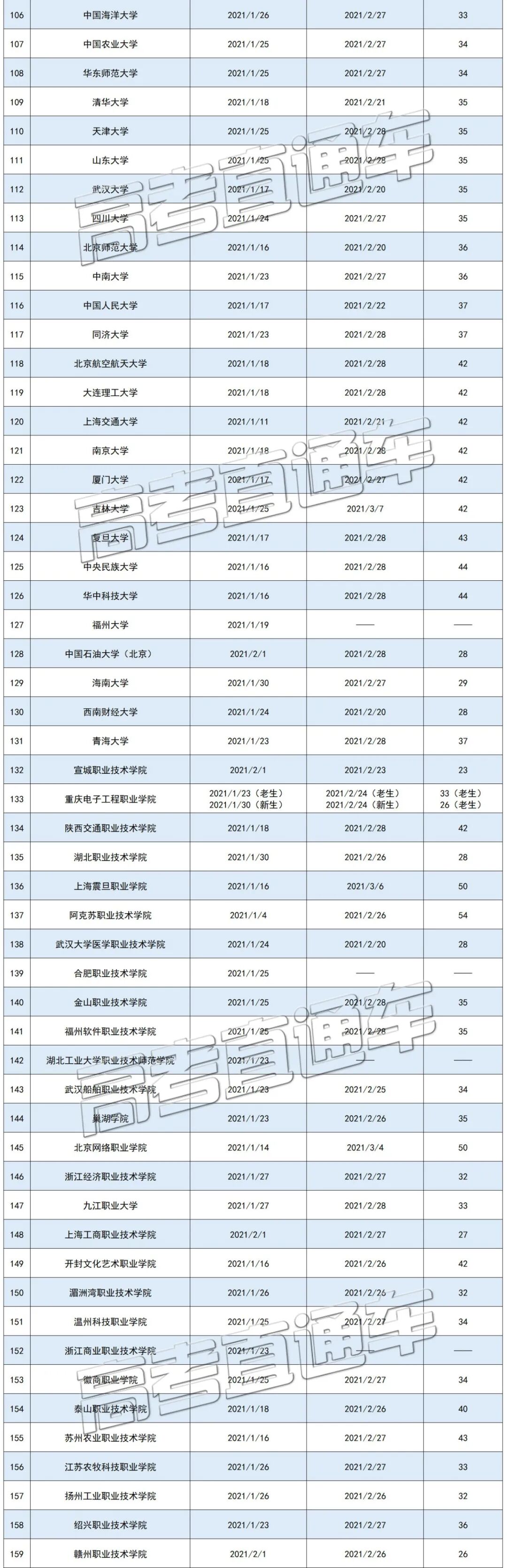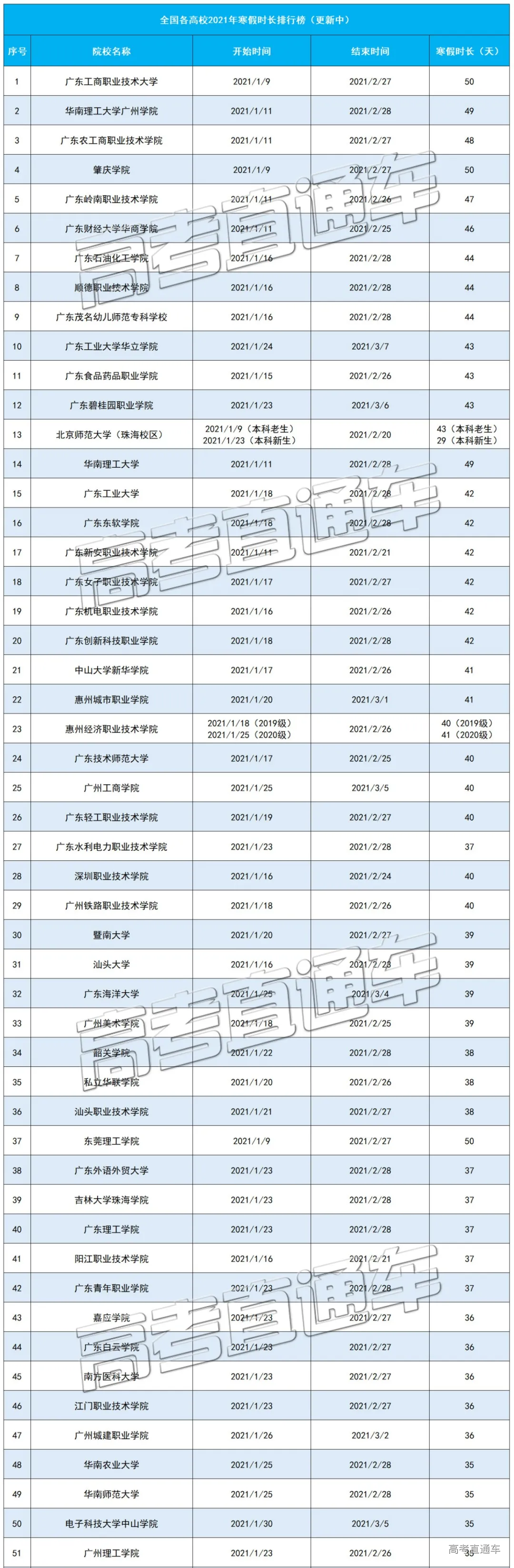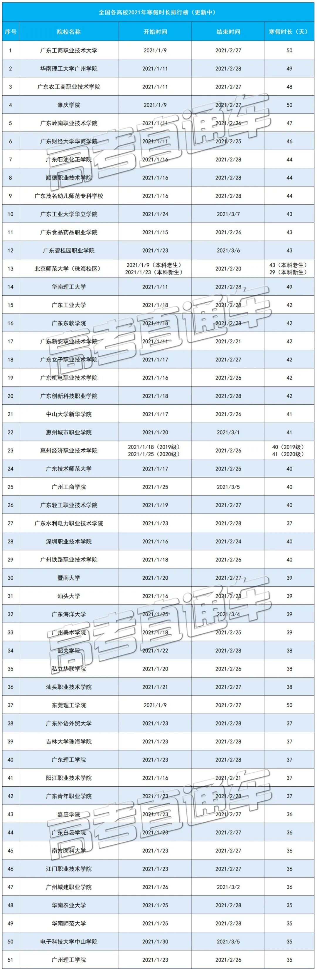国庆小长假已过,这个国庆你放了几天假呢?这段时间,部分学校调整了国庆放假天数,但是相对应的也延长或提前了寒假的放假时间,那各个高校最新的寒假时间是什么时候?哪个学校寒假最长? 说明: 1.本表格数据整理自各校官微、校历等,仅供参考,由于有部分学校调整了国庆假期以延长寒假时间,实际放假时间请以学校最新通知为准。 2.本表为不完全盘点,只含部分广东高校及省外高校,欢迎其他高校同学留言补充! 可以看出,大部分高校都是在1月底放假,2月底开学。那么哪些学校拥有最长和最短寒假? 放假最早:从整理的数据来看,北京交通职业技术学院放假最早,12月18日就开始放假,别人还在等待元旦假期他们就开始寒假的狂欢了。濮阳职业技术学院12月21日也开始放假,香港中文大学(深圳)和中国音乐学院“不甘落后”,12月26日正式放假。另外,中国传媒大学从元旦当天开始放寒假,也算是“早人一步”。除此之外,阿克苏职业技术学院、广东工商职业技术大学、肇庆学院、东莞理工学院、中国政法大学、海南经贸职业技术学院等都在1月10日之前放假。 开学最晚:大部分学校都是在2月底开学,但也有部分学校3月初才开学。其中,吉林大学和广东工业大学华立学院最晚开学,3月7日才回校报到,上海震旦职业学院、广东碧桂园职业学院、东北大学秦皇岛分校、山东外事职业大学3月6日,成都东软学院、成都艺术职业大学、电子科技大学中山学院也都在3月5日正式结束寒假。广州华南商贸职业学院、惠州城市职业学院、广州城建职业学院、广东科贸职业学院、广州中医药大学等多所学校也要3月份之后才开学。 寒假最长:俗话说,放得早不如放得久,但最让人“羡慕嫉妒恨”的莫过于放得早还放得久。从目前的统计情况来看,作为放假时间最早的北京交通职业技术学院,不仅元旦前半个月就放假,而且等到2021年2月26日才正式开学,寒假时长高达71天,两个多月的寒假同学们都想好去哪里浪了吗?其次是中国传媒大学,寒假时间也有59天,相当于别人的一个暑假,实在是羡慕了!广东工商职业技术大学、肇庆学院、东莞理工学院、中国政法大学、广州华南商贸职业学院等多所高校的寒假天数也有50天。 放假最晚:广东以色列理工学院“喜提”最晚放假学校,要等到2月11日才开始放假。北京师范大学-香港浸会大学联合国际学院2月5日开始放假,广州中医药大学、北京理工大学、东南大学、中国石油大学(北京)、北京理工大学珠海学院、北京体育大学等都要2月份之后才开始假期。 开学最早:开学最早的是香港中文大学(深圳),1月10日就开学了,这时候还有很多学校都还没放假呢。开学第二早的则是西华师范大学,2月14日开学,新疆大学2月16日开学,广东以色列理工学院,2月17日开学;然后是北京师范大学珠海分校,2月18日开学。 不过放假早晚只是相对的,有些学校放假晚,开学也晚,所以寒假天数也很长。但有的学校就不一样了,放假早,开学更早,或者放假晚,开学早,所以寒假短的可怜...... 假期最短:心疼广东以色列理工学院的同学,整个寒假只有7天时间,还没有国庆小长假多,回家过个年就要回学校了。香港中文大学(深圳)寒假稍微长一点,但是也只有16天,北京师范大学-香港浸会大学联合国际学院紧随其后,寒假天数17天,除了这几所高校,其他高校基本都是20天以上。 你的学校什么时候放假呢?放假几天?