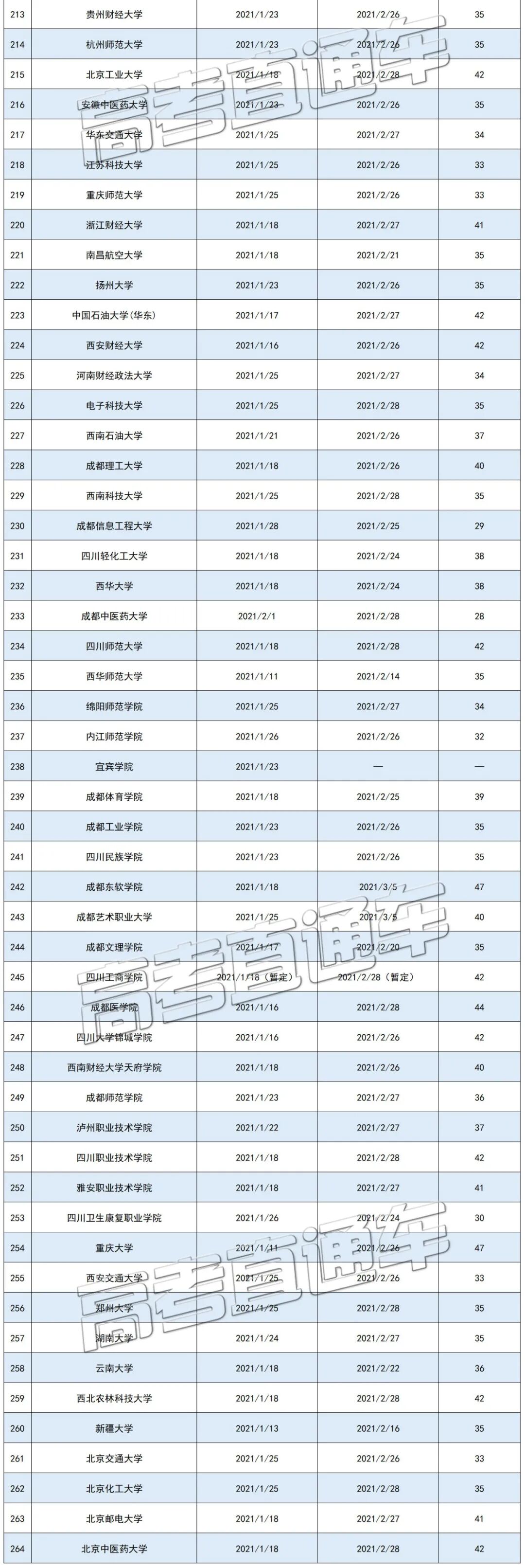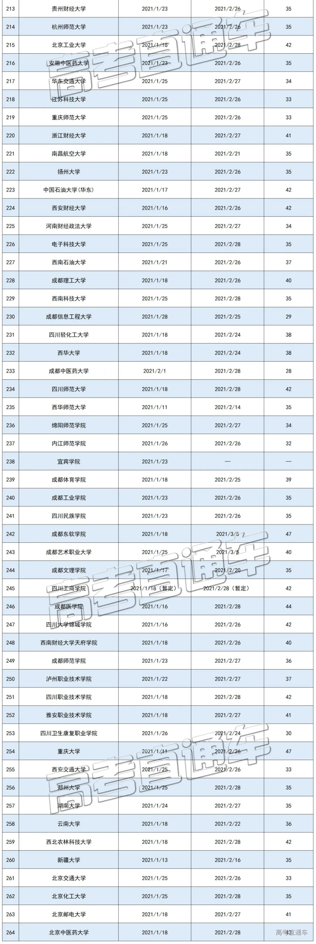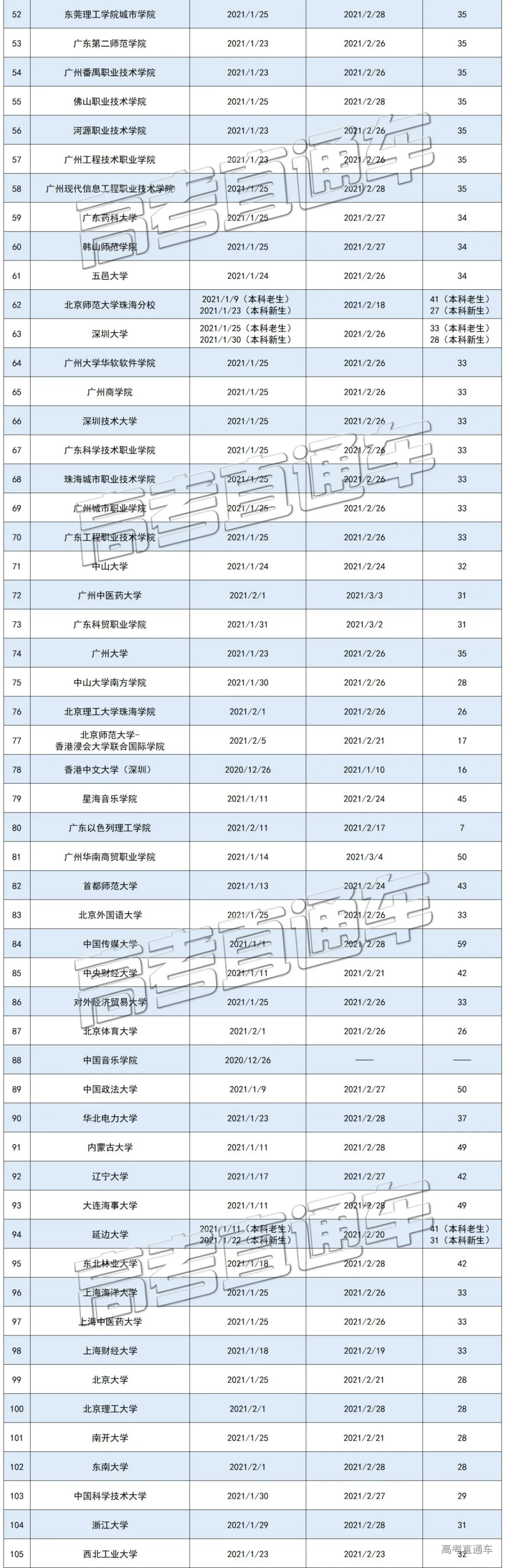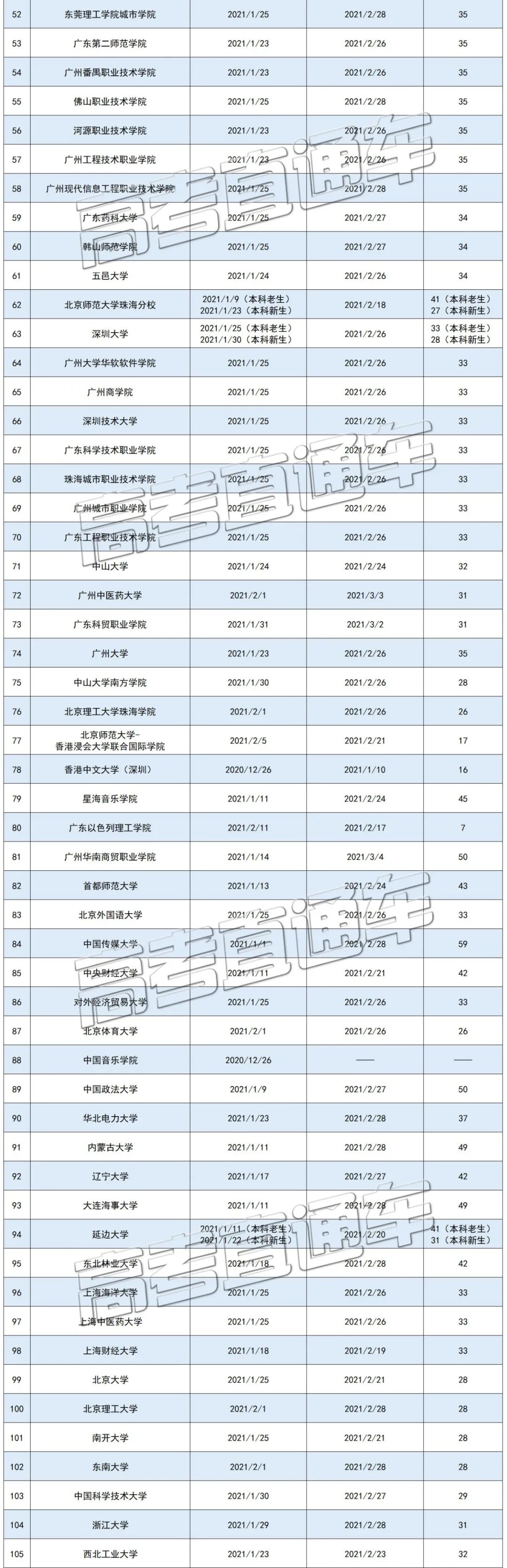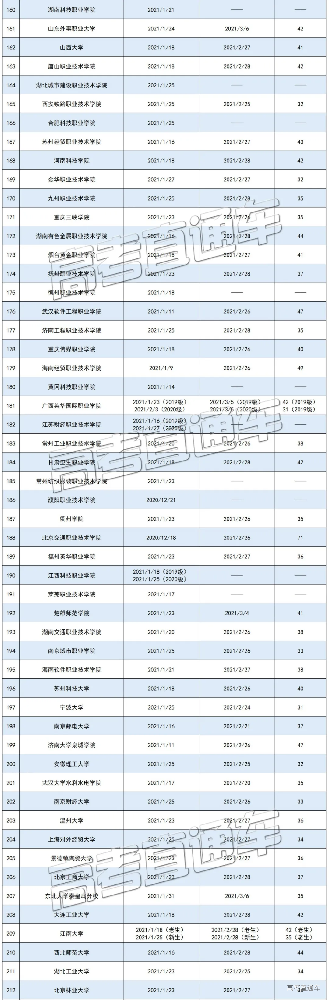 国庆小长假已过,这个国庆你放了几天假呢?这段时间,部分学校调整了国庆放假天数,但是相对应的也延长或提前了寒假的放假时间,那各个高校最新的寒假时间是什么时候?哪个学校寒假最长? 说明: 1.本表格数据整理自各校官微、校历等,仅供参考,由于有部分学校调整了国庆假期以延长寒假时间,实际放假时间请以学校最新通知为准。 2.本表为不完全盘点,只含部分广东高校及省外高校,欢迎其他高校同学留言补充! 可以看出,大部分高校都是在1月底放假,2月底开学。那么哪些学校拥有最长和最短寒假? 放假最早:从整理的数据来看,北京交通职业技术学院放假最早,12月18日就开始放假,别人还在等待元旦假期他们就开始寒假的狂欢了。濮阳职业技术学院12月21日也开始放假,香港中文大学(深圳)和中国音乐学院“不甘落后”,12月26日正式放假。另外,中国传媒大学从元旦当天开始放寒假,也算是“早人一步”。除此之外,阿克苏职业技术学院、广东工商职业技术大学、肇庆学院、东莞理工学院、中国政法大学、海南经贸职业技术学院等都在1月10日之前放假。 开学最晚:大部分学校都是在2月底开学,但也有部分学校3月初才开学。其中,吉林大学和广东工业大学华立学院最晚开学,3月7日才回校报到,上海震旦职业学院、广东碧桂园职业学院、东北大学秦皇岛分校、山东外事职业大学3月6日,成都东软学院、成都艺术职业大学、电子科技大学中山学院也都在3月5日正式结束寒假。广州华南商贸职业学院、惠州城市职业学院、广州城建职业学院、广东科贸职业学院、广州中医药大学等多所学校也要3月份之后才开学。 寒假最长:俗话说,放得早不如放得久,但最让人“羡慕嫉妒恨”的莫过于放得早还放得久。从目前的统计情况来看,作为放假时间最早的北京交通职业技术学院,不仅元旦前半个月就放假,而且等到2021年2月26日才正式开学,寒假时长高达71天,两个多月的寒假同学们都想好去哪里浪了吗?其次是中国传媒大学,寒假时间也有59天,相当于别人的一个暑假,实在是羡慕了!广东工商职业技术大学、肇庆学院、东莞理工学院、中国政法大学、广州华南商贸职业学院等多所高校的寒假天数也有50天。 放假最晚:广东以色列理工学院“喜提”最晚放假学校,要等到2月11日才开始放假。北京师范大学-香港浸会大学联合国际学院2月5日开始放假,广州中医药大学、北京理工大学、东南大学、中国石油大学(北京)、北京理工大学珠海学院、北京体育大学等都要2月份之后才开始假期。 开学最早:开学最早的是香港中文大学(深圳),1月10日就开学了,这时候还有很多学校都还没放假呢。开学第二早的则是西华师范大学,2月14日开学,新疆大学2月16日开学,广东以色列理工学院,2月17日开学;然后是北京师范大学珠海分校,2月18日开学。 不过放假早晚只是相对的,有些学校放假晚,开学也晚,所以寒假天数也很长。但有的学校就不一样了,放假早,开学更早,或者放假晚,开学早,所以寒假短的可怜...... 假期最短:心疼广东以色列理工学院的同学,整个寒假只有7天时间,还没有国庆小长假多,回家过个年就要回学校了。香港中文大学(深圳)寒假稍微长一点,但是也只有16天,北京师范大学-香港浸会大学联合国际学院紧随其后,寒假天数17天,除了这几所高校,其他高校基本都是20天以上。 你的学校什么时候放假呢?放假几天?