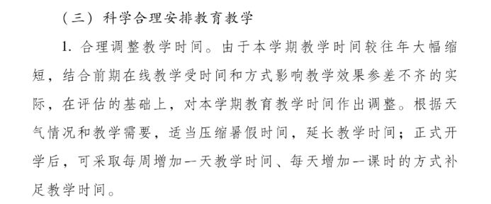 这份文件还说明,由于本学期教学时间较往年大幅缩短,结合前期在线教学受时间和方式影响教学效果参差不齐的实际,在评估的基础上,对本学期教育教学时间作出调整。根据天气情况和教学需要,适当压缩暑假时间,延长教学时间;正式开学后,可采取每周增加一天教学时间、每天增加一课时的方式补足教学时间。
