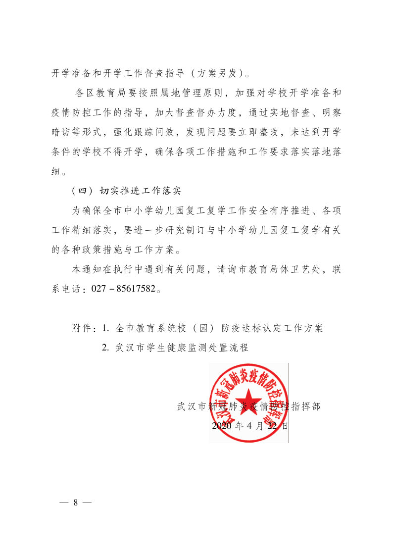 近日,网上流传着这样一份文件:《关于做好2020年春季学期全市中小学幼儿园开学工作的通知》(如下图),该文件对武汉中小学开学时间、开学安排、校园防疫工作、学生健康监测流程进行了全面阐释,先一起来看看文件全文(非官方正式发布,仅供参考):