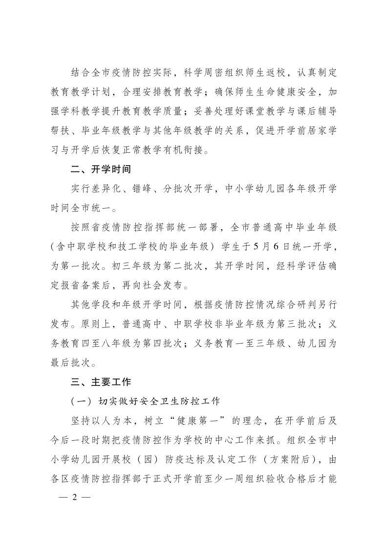 全市普通高中毕业年级 (含中职学校和技工学校的毕业年级) 学生于5月6日统一开学,为第一批次。初三年级为第二批次,其开学时间,经科学评估确定报省备案后,再向社会发布。