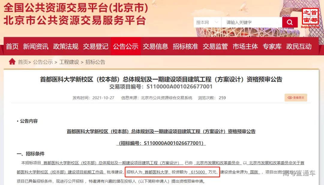 近期,北京市公共资源交易服务平台公布了《首都医科大学新校区(校本部)总体规划及一期建设项目建筑工程(方案设计)资格预审公告(招标资审公告)》。