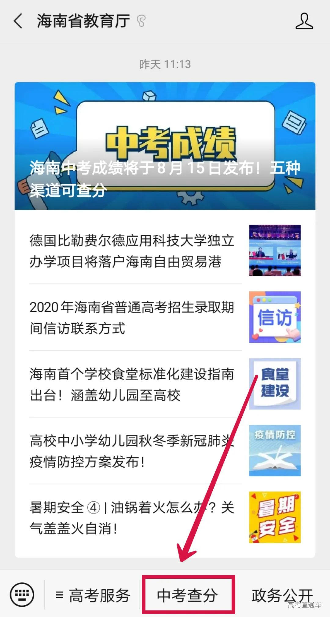 考生可关注海南省考试局政务微信公众号——海南考试(微信号:hnkswx可用微信扫描下图二维码),点击“中考服务”菜单查询(本途径只提供九年级考生成绩查询)。