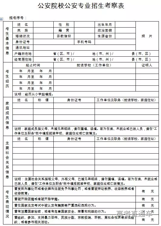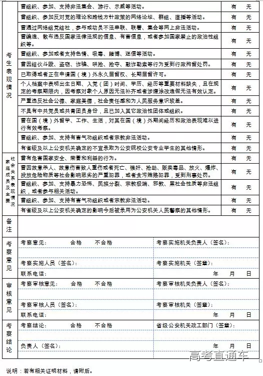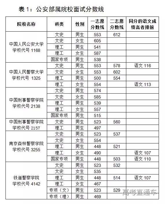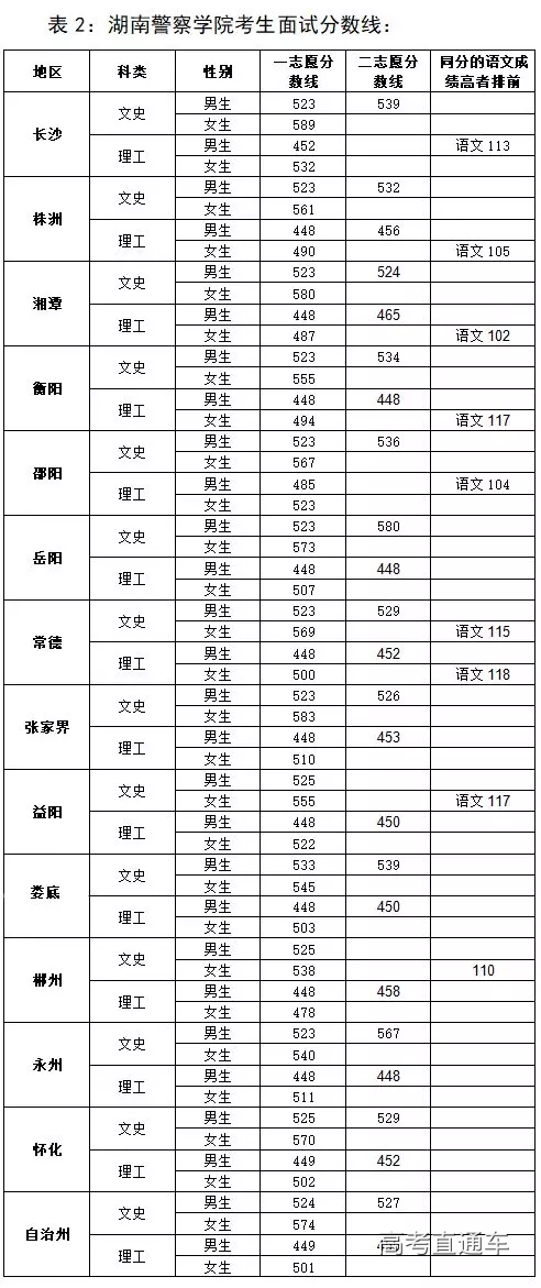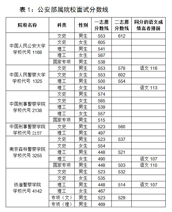 湖南省2019年公安普通高等院校公安专业本科批次面试入围分数线详见表1、表2: 请报考了上述院校公安专业并达到面试分数线的16周岁以上22周岁以下(1997年9月1日至2003年8月31日期间出生)湖南省户籍生源考生,按《湖南省2019年公安普通高等院校公安专业报考须知》做好考察工作,并于2019年7月3日至5日期间的任意一天,到湖南警察学院参加面试、体能测评和体检。该《须知》已分别于6月24日、6月25日在湘警网“信息公开”栏和湖南招生考试信息港“招考动态”栏内公布,请考生自行查阅。 附:湖南省2019年公安普通高等院校公安专业报考须知 为确保2019年公安普通高等院校公安专业在湘招生工作顺利进行,湖南省公安厅、湖南省教育考试院现将有关事项公告如下: 一 报考条件 2019年在湘招生的公安普通高等院校包括:中国人民公安大学、中国人民警察大学、中国刑事警察学院、铁道警察学院、南京森林警察学院、湖南警察学院和西藏警官高等专科学校。报考上述院校公安类专业的考生,除西藏警官高等专科学校安排在专科提前批次录取外,其余院校均安排在本科提前批次录取。考生须具备以下条件: 1.普通高级中学毕业。 2.具有湖南省内户籍。其中,湖南警察学院公安类专业按户籍分市州定向招生,招生计划按市州编制。 3.年龄为16周岁以上、22周岁以下(1997年9月1日至2003年8月31日期间出生),未婚。 4.思想政治素质好,符合公安院校公安专业招生政治条件(标准见下文)。 5.身心健康,符合公安院校公安专业招生体能测评和体检标准(标准见下文)。 6.高考成绩达到院校所在批次录取控制分数线。 符合上述条件,且填报了上述公安院校公安专业志愿的考生,须参加并通过由湖南省公安厅组织的考察、面试、体能测评和体检。省教育考试院分别按照文理科、男女生招生计划数5倍的比例(其中湖南警察学院女生按3倍的比例)从高分到低分提供参加考察、面试、体能测评和体检的考生名单,省公安厅、教育考试院将通过多种方式、途径通知考生参加。 (一)考察程序及标准 考察按照下列程序进行:请考生自行到“湖南招生考试信息港”或湖南省公安厅门户网站“湘警网”下载《公安院校公安专业招生考察表》(附件1)并完整填写个人信息(审查内容项由公安机关填写,考生不得填写,涂改无效)。该表须用A4纸正反面打印、贴本人近期小一寸免冠正面照片。7月2日前由考生或家长交至考生户籍地辖区派出所进行审核,逾期不予受理。如果考生及其家庭成员和主要社会关系存在考察表内所列23种情形中任一情形者,考察不合格。表内“家庭成员”指父母(监护人、直接抚养人,包括有共同生活经历的养父母、有抚养关系的继父母)、未婚兄弟姐妹(包括有共同生活经历的同父异母或同母异父兄弟姐妹、养兄弟姐妹,有抚养关系的继兄弟姐妹),“主要社会关系”指祖父母、外祖父母、已婚兄弟姐妹。完成考察后,相关材料由实施考察审核的派出所逐级提交上级公安机关。 (二)面试程序及内容 面试主要从报考动机、言语表达、心理健康、人民警察职位匹配性、身体协调性等方面进行考核,考核结果作为辨识考生是否适合接受公安院校教育、从事公安工作的依据。同时会对所有考生的身高、体重、色觉等进行初步审查。 (三)体能测评标准及测试办法 50米跑。可测次数:1次,合格标准:男性≤9.2秒,女性≤10.4秒; 立定跳远。可测次数:3次,合格标准:男性≥2.05米,女性≥1.5米; 1000米跑(男)/800米跑(女)。可测次数:1次,合格标准:男性≤4分35秒,女性≤4分36秒; 引体向上(男)/仰卧起坐(女)。可测次数:1次,合格标准:男性≥9次/分钟,女性≥25次/分钟。 以上4个项目须全部进行测评,有3项及以上达标的,体能测评结论为合格。 (四)体检项目及标准 体检项目和标准,参照公安机关录用人民警察的有关规定执行,详见《公务员录用体检通用标准(试行)》(人社部发〔2016〕140号)、《公务员录用体检特殊标准(试行)》(人社部发〔2010〕82号)。同时,还应符合下列条件: 身高:男性170厘米及以上,女性160厘米及以上。 体重:男性体重指数在17.3至27.3之间,女性在17.1至25.7之间。体重指数计算公式为体重(kg)除以身高的平方(㎡)。 视力:双眼单侧裸眼视力4.8及以上。 色觉:无色盲、色弱。 面容:无影响面容且难以治愈的皮肤病,如白癜风、银屑病、血管瘤、斑痣等。 外观:外观不存在明显疾病特征,如五官畸形(如唇裂、对眼、斜眼等)、不能自行矫正的斜颈等;没有文身;无三度单纯性甲状腺肿。面部无明显疤麻、无鸡胸、无腋臭、无明显罗圈腿、无重度平脚板、无驼背,无各种残疾。 血压:收缩压小于140mmHg;舒张压小于90mmHg。 听力:双耳单侧耳语听力大于5米。 嗅觉:无嗅觉迟钝、无嗅觉丧失。 以上重点项目,除在面试过程中进行检测外,还将组织集中体检。集中体检另外增加血检项目,主要开展艾滋病、梅毒、肝功能等检测。体检由具备资质的医院专业医生按照操作规范进行,并由主检医师综合作出体检是否合格的结论。体检项目不予复查。 考生须对面试和体检没有检查的项目、本人患病经历和有关情况作出承诺,承诺本人不存在影响录用的各种疾病或情形,如实填写并承诺信息真实准确,如有不实,考生自行承担被取消录取等后果。请考生自行到“湖南招生考试信息港”或湖南省公安厅门户网站“湘警网”下载