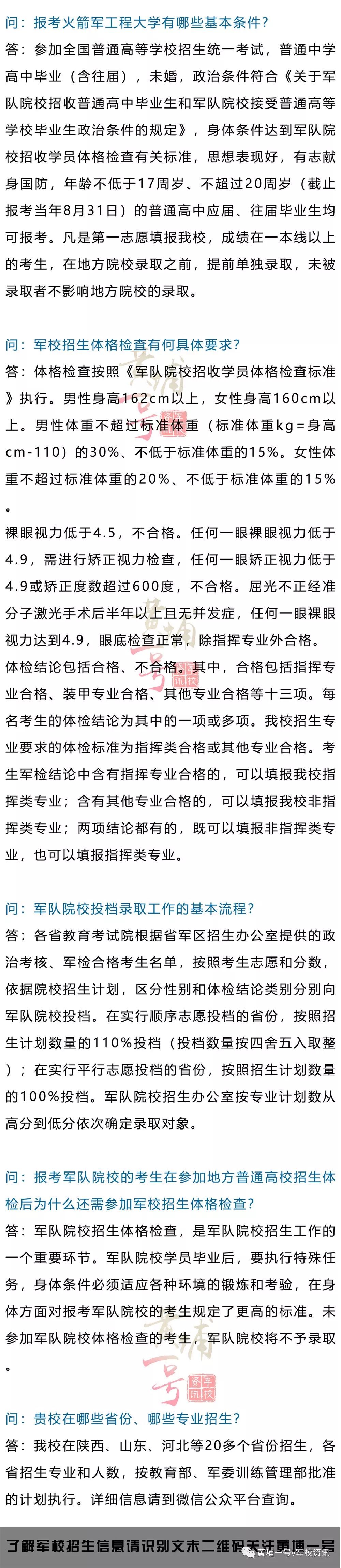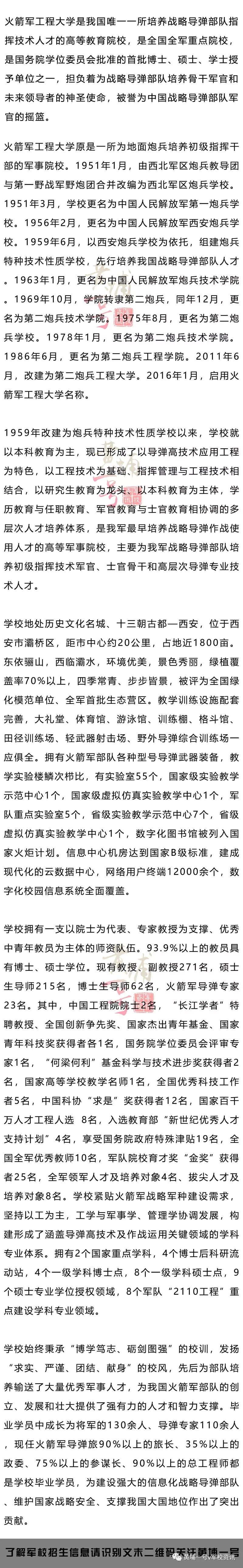 LTE通信、音视频传输等实验室,实验环境与实验条件优越。 ▲指挥信息系统工程专业主要培养火箭军指挥控制、计算机及网络、信息通信领域专业技术人才和指挥管理人才。该专业主要学习计算机技术、信息系统、军事通信、系统分析与集成和指挥控制的基本理论知识,掌握指挥信息系统分析、设计、评估、优化的基本技能与方法,具备从事作战指挥决策支持、信息系统管理集成、高技术装备使用维护的能力。指挥信息系统工程是全军重点建设专业,是我校计算机科学与技术一级学科博士授权点的主要支撑,拥有火箭军导弹专家3人、教授5人、军队院校育才奖金奖获得者2人,建有军队重点实验室和国家级精品课程等教学平台,获国家科技进步奖1项、军队或省部级科技进步奖10余项。 ▲“武器发射工程”专业是研究导弹武器系统发射理论及运用技术的一门综合性工程技术学科专业,主要培养从事导弹武器发射系统作战指挥、运用管理、维修监造和研究的初级指挥技术军官。本专业2012年被列入陕西省综合改革试点专业,现拥有国家实验教学示范中心和军队重点实验室,形成了一支院士领军,国家有突出贡献中青年专家、全国全军优秀教师、中国科协“求是”奖获得者、全国优秀科技工作者等为骨干的优秀教研团队,该团队2008年获得军队科技创新群体奖,2009年被中央军委记集体一等功,先后获国家和军队教学成果奖10余项、科技进步奖70多项。 ▲测控工程专业主要培养从事导弹测试和发射控制系统指挥运用、维护管理、监造和研究的高素质初级指挥技术军官。本专业是火箭军工程大学开设最早的本科专业之一,是火箭军工程大学的骨干专业,2012年被列入陕西省综合改革试点专业。本专业师资力量雄厚,拥有一支院士领衔,国家教学名师、国家杰出青年科学基金获得者、长江学者、火箭军导弹专家为骨干的高层次教研队伍,专业教学团队被评为陕西省优秀教学团队。教学资源丰富,拥有国家级虚拟仿真实验教学中心、军队重点实验室等高水平教学平台和以国家级精品课程、陕西省精品课程等代表的高质量课程体系。近五年获得国家和军队级教学成果奖10余项、科技进步奖30余项。 ▲导弹工程专业主要培养从事近中程常规导弹武器系统作战运用、维护管理的初级指挥技术军官。该专业是为适应常规导弹武器发射设备与导弹控制系统一体化设计及作战运用新发展,瞄准常规导弹测试发射作战指挥岗位需求于2012年设立,并充分继承了测控工程与发射工程两大主干专业人才培养经验及成果。拥有一支院士领衔,国家教学名师、火箭军导弹专家为骨干的教研队伍。教学资源丰富,拥有国家级虚拟仿真实验教学中心和实验教学示范中心、军队重点实验室及多种武器装备实战化训练平台。构建了以国家级精品课程、陕西省精品课程等代表的高质量课程体系。 ▲电气工程及其自动化专业主要培养从事导弹阵地综合保障系统运行控制、维护管理、设计研究的高素质初级指挥军官。作为火箭军传统骨干特色专业,本专业以军用电力工程为主线,以阵地环境保障和综合信息管理为支撑,具有强弱电结合、机电结合、系统运行与控制结合的专业特色,2014年被列入陕西省综合改革试点专业。本专业师资力量雄厚,拥有一支国家百千万人才工程入选者领衔,陕西省教学名师、军队学科拔尖人才、军队院校育才奖获得者、火箭军导弹专家为骨干的高层次教研队伍,专业教学团队被评为陕西省优秀教学团队。教学资源丰富,拥有陕西省实验教学示范中心、虚拟仿真实验教学中心、军队重点实验室等高水平教学平台。 ▲机械工程专业培养具备坚定的献身国防信念,在机械工程领域掌握扎实的基础理论和专业知识,从事火箭军特种导弹装备和工程机械运用、管理、维修、监造和研究的高素质初级指挥军官和技术人才。本专业是火箭军工程大学的骨干专业,多年的办学实践中,遵循军事高等教育基本规律,构建了宽口径、强基础、重实践、求创新的人才培养体系,具有显著的系统工程和军事应用特色。本专业拥有以军队2110工程重点实验室和国家重点学科专项建设实验室为基础的丰富教学资源,教学师资队伍结构合理、业务精良,先后获得国家军队科技进步一等奖1项、二等奖2项,军队科技进步奖20余项,为火箭军部队培养大批高素质人才。 ▲飞行器动力工程专业主要研究飞行器系统总体与推进理论及应用技术。经过50多年建设,拥有“航空宇航科学与技术”一级学科硕士、博士授予权,设有“航空宇航科学与技术”博士后流动站,学科曾获省部级一等奖5项。承担着火箭军部队从事导弹武器总体与发动机指挥、管理、维护、监造和研究的高素质初级指挥军官和技术人才的培养任务。本学科现有教员35人,拥有一支以973首席科学家领衔的老、中、青相结合的教员团队,其中教授9人、副教授10人,博导7人、硕导10人,火箭军导弹专家3人,3人享受政府特贴;拥有1个军队重点实验室、3个“2110”工程重点建设子实验室,教学科研体系完备,是火箭军重要的人才培养、科技创新和作战保障基地。 ▲特种能源工程与技术专业主要培养从事导弹推进剂分析监测、安全管理及军事环境保护工作的初级指挥技术军官。该专业以导弹武器特种能源为研究对象,开展导弹推进剂快速分析与性能检测、