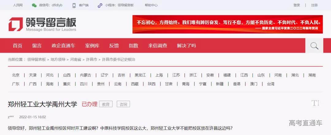 1月中旬,有网友在人民网领导留言板以“郑州轻工业大学禹州大学”为题,询问郑州轻工业禹州校区何时开工建设。