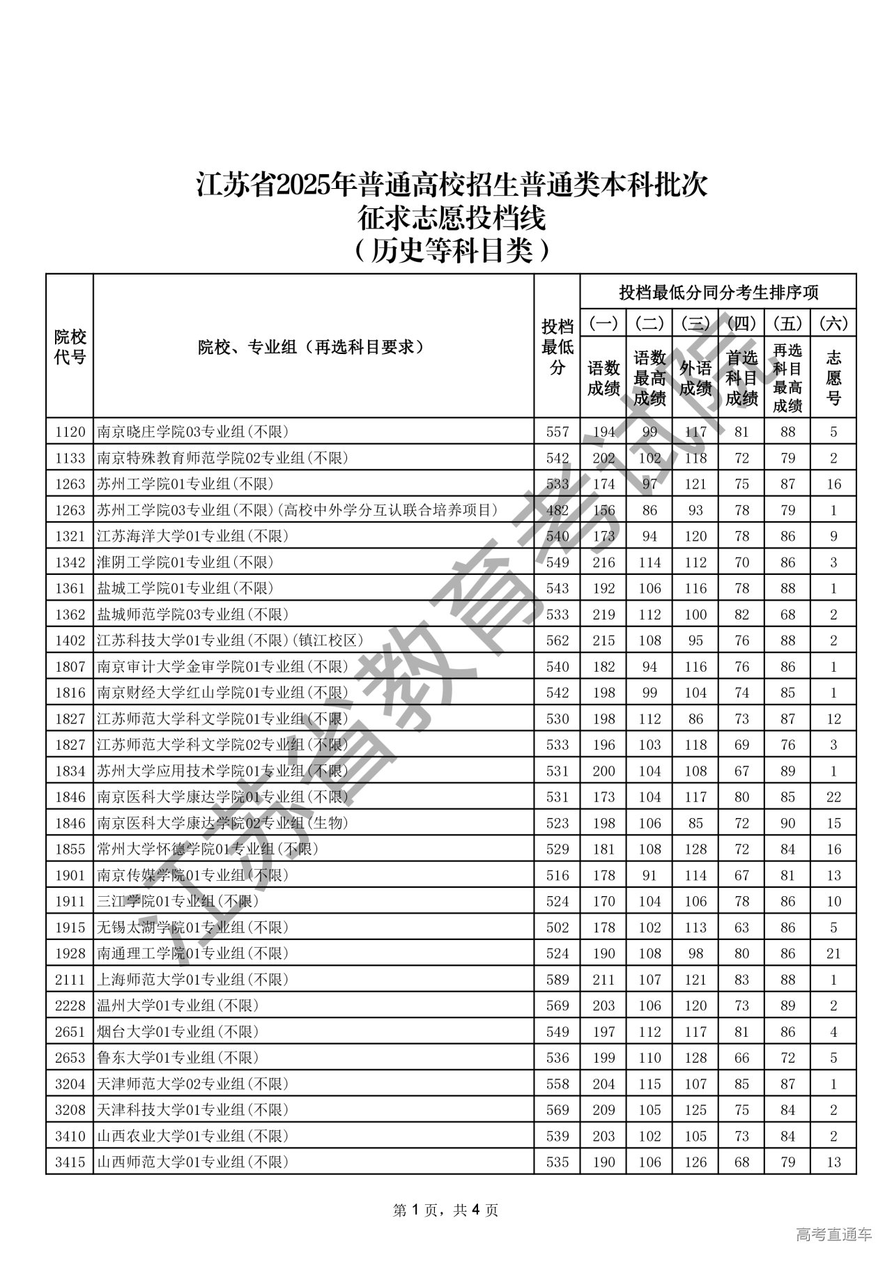 江苏省2025年普通高校招生普通类本科批次征求志愿投档线(历史等科目类).pdf