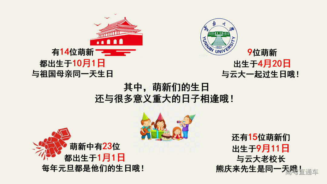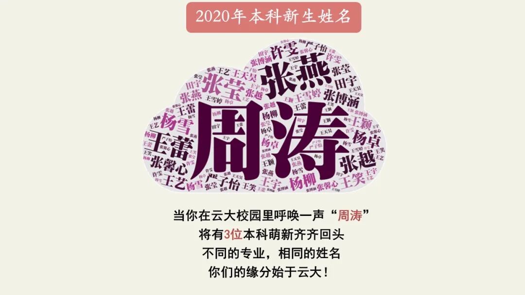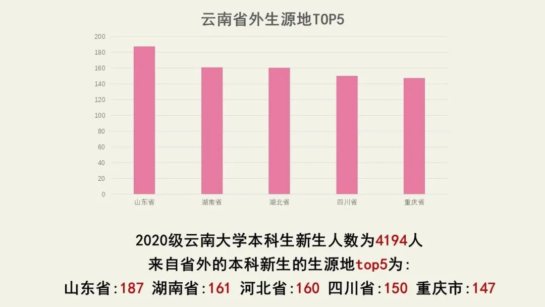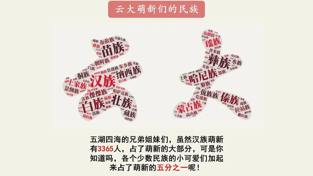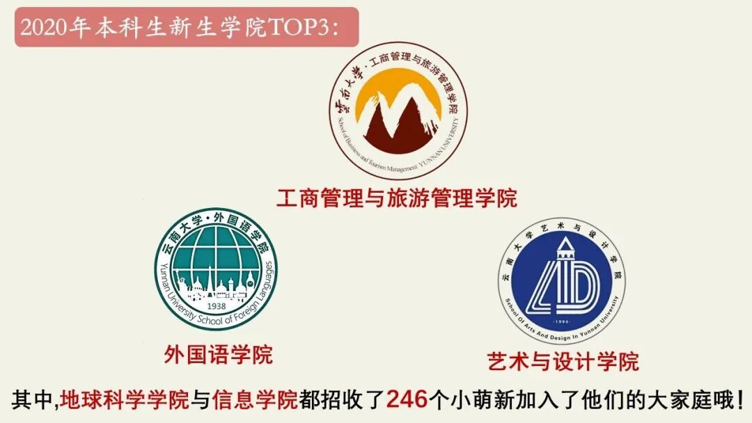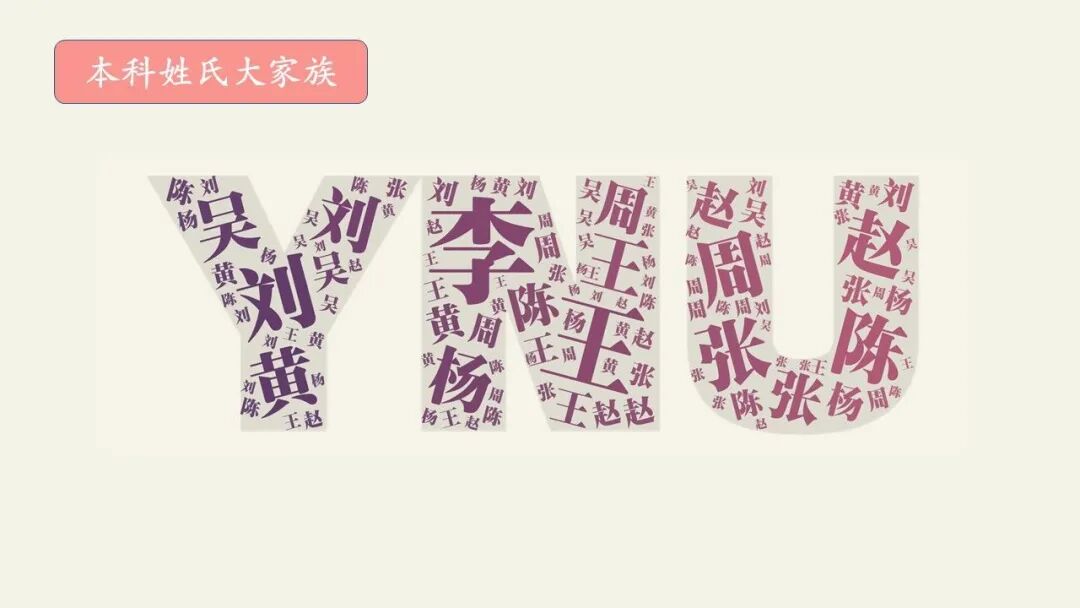 1 萌新们自天南海北相聚于云大 而云南、山东、湖南的YNUer们 更容易遇到与自己籍贯相同的同学哦! 不过,相信在往后的学习生活里 YNUer们都能遇到更多志同道合的朋友 在距家几千里外 收获温暖与成长! 新晋YNUer有4194人 究竟哪些院系拥有的萌新更多呢? 萌新们快来找找自己的学院在哪里吧 |•'-'•)و✧ 2020年 我们共迎来了4194位小萌新 那么具体的男女比例究竟如何呢? 请看下图—— 2020年 00后萌新们 已经成为校园的主力军啦! 还有许多萌新出生在非常有意义的日子 快来寻找一下和你同一天生日的小伙伴吧! 姓名往往是YNUer们彼此了解的第一步 2020级萌新们姓氏众多 快看看有多少萌新们与你姓氏相同 又有多少“有缘人”与你重名呢? 欢迎各民族的 小伙伴们加入云大这个大家庭! 让我们在未来的日子里 一起学习、成长和进步吧! 确认过眼神 是优秀的YNUer没错了 YNUer们要继续加油鸭! 在未来的四年里 遇见更好的自己!