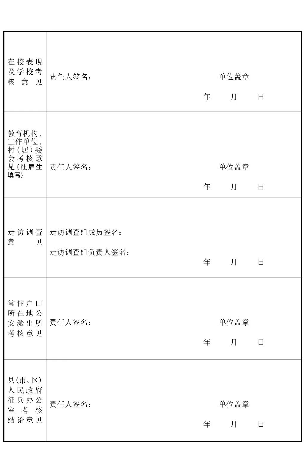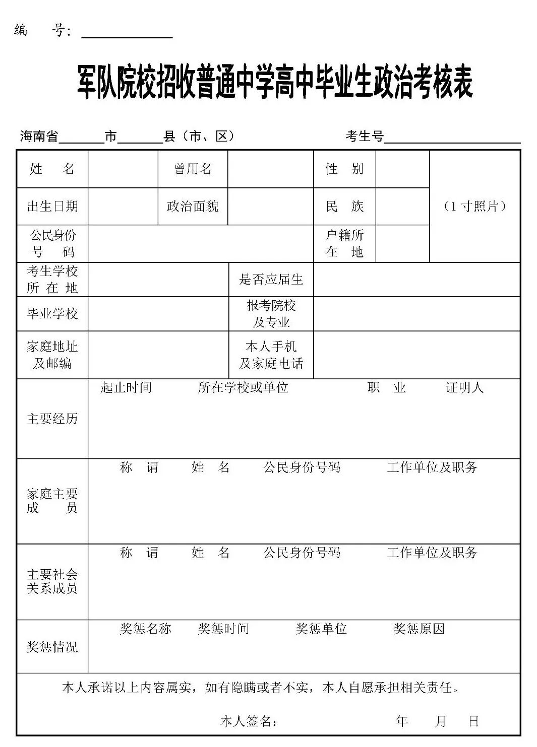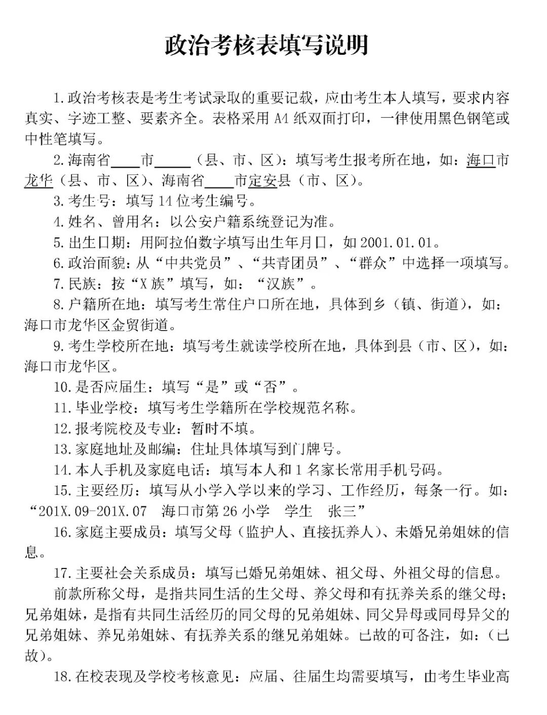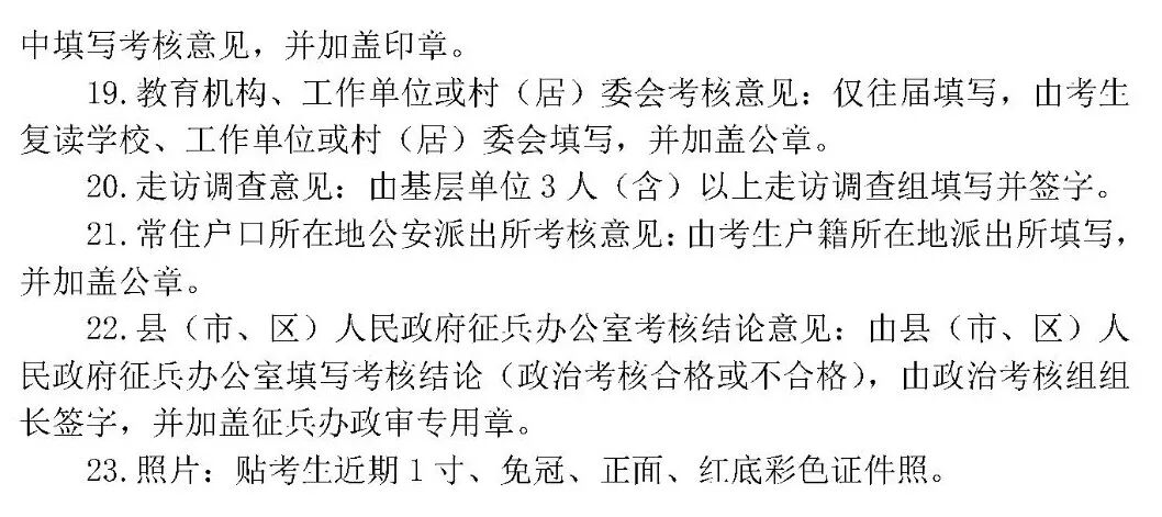 为做好2020年军队院校招收普通中学高中毕业生政治考核工作,根据《中国人民解放军院校招生工作条例》《军队院校招收普通中学高中毕业生工作实施细则》等文件精神,军分区、人武部近期展开此项工作,现就有关问题明确如下:政治考核对象为志愿报考军队院校的考生。基本条件:①参加2020年度全国普通高等学校招生统一考试的普通高中应届、往届毕业生;②年龄不低于17周岁、不超过20周岁(截止2020年8月31日);③未婚。政治考核按照《关于军队院校招收普通高中毕业生和军队院校招收普通高等学校毕业生政治考核条件的规定》执行,参照《征兵政治考核工作规定》组织实施。7月11日开始,截止时间为7月28日17时30分。特别提醒:考生务必于政治考核截止时间前2-3天到高考报考所在地县(市、区)级人民武装部(地址及联系电话详见附件)报名参加政治考核,并在人武部的指导下完成个人信息采集及开展后续工作。逾期未参加政治考核或考核不合格者,根据《军队院校招收普通中学高中毕业生工作实施细则》有关规定,不能参加面试和体检。7月18日后,志愿报考军队院校考生严禁前往疫情中、高风险地区,参加面试体检时需提供个人近期行踪记录和健康码。(一)警备区(军分区)、县(市、区)人武部、市县招办警备区统筹辖区军队院校招生政治考核工作,指导所属区人武部开展政治考核。儋州军分区、县(市、区)级人武部会同市县招办、考生户籍所在地派出所和所在学校,具体实施考生政治考核工作。考生户籍所在地与其就读的普通中学、教育机构或工作单位等不在同一区域的,政治考核工作由考生报考所在地的县(市、区)人武部负责,考生户籍所在地的县(市、区)人武部配合。市县招办负责通知并指导辖区普通中学落实军队院校招生政治考核工作,配合警备区(军分区)、人武部开展考生政治考核。普通中学要积极做好军队院校招生宣传工作,及时将军队院校招生政治考核事宜告知考生,鼓励并推荐成绩优异、品行端正的考生报考军队院校,考核考生在校表现情况。(一)考生报名。考生到高考报考所在地县(市、区)级人武部报名参加政治考核,领取《军队院校招收普通中学高中毕业生政治考核表》(以下简称《政治考核表》),或自行从海南省考试局官方网站(网址:ea.hainan.gov.cn)下载并正反两面打印《政治考核表》,按照填写说明完成个人信息栏目填写,并在人武部完成个人信息采集。(二)学校鉴定。考生所在学校对考生在校表现做出鉴定,在《政治考核表》相应栏目签署意见并加盖印章。往届考生另外需要就读的教育机构、工作单位或村(居)委会进行考核,在《政治考核表》相应栏目签署意见并加盖印章。(三)走访调查。乡(镇)、街道人民武装部会同辖区派出所,组织村(居)委会、学校、村(社区)警务室或者片区民警等有关人员组成走访调查组,对考生现实表现、家庭成员和主要社会关系成员等作进一步考核,在《政治考核表》相应栏目签署意见并加盖印章。(四)公安派出所考核。考生户籍所在地派出所根据走访调查情况及掌握的其他有关情况,对考生本人、家庭情况和主要社会关系等作进一步考核后,在《政治考核表》相应栏目签署意见并加盖单位印章。(五)人武部考核。县(市、区)人民武装部综合考生所在中学鉴定意见、基层单位走访调查意见、户籍所在地派出所考核意见,客观公正地对考生做出考核结论,在《政治考核表》相应栏目签署意见,由单位主要领导签字,并加盖政治考核专用章。考生《政治考核表》留存在县(市、区)人民武装部。(六)公布结论。县(市、区)人民武装部将考生政治考核结论通知考生本人。对考核结论有异议的,应当组织复议。(七)上报合格考生名册。警备区(军分区)、直属人武部将参加政治考核考生名册加盖单位公章,于7月28日17时30分前报省军区招生办公室。(八)公布入围面试体检考生名单。7月30日,省考试局、省军区招生办公室依据军队院校招生有关规定,划线确定入围面试体检考生名单,并在省考试局官方网站公示。(九)送交原件。8月1日18时前,各单位将入围面试体检考生《政治考核表》原件送交省军区招生办公室。政治考核是军队院校招生工作的重要环节,事关人民军队的纯洁巩固,事关考生切身利益,敏感性、政策性强。军地双方要站在国防和军队建设的高度,切实加强组织领导,精心筹划、严密组织,确保按时间节点完成考核任务。要把政治合格作为青年学生报考军队院校的首要条件,全面考察考生本人、家庭成员和主要社会关系情况,从源头上严把政治关口。要严格执行考核政策规定,认真落实考核责任制,坚持谁考核、谁签字、谁负责。对考核过程中发现的违规违纪问题,将依据相关政策法规严肃追究当事人和单位领导责任。附件:1.海南省军队院校招生政治考核报名地点及联系电话2.《军队院校招收普通中学高中毕业生政治考核表》及填写规范