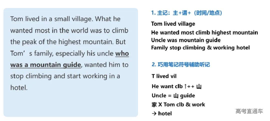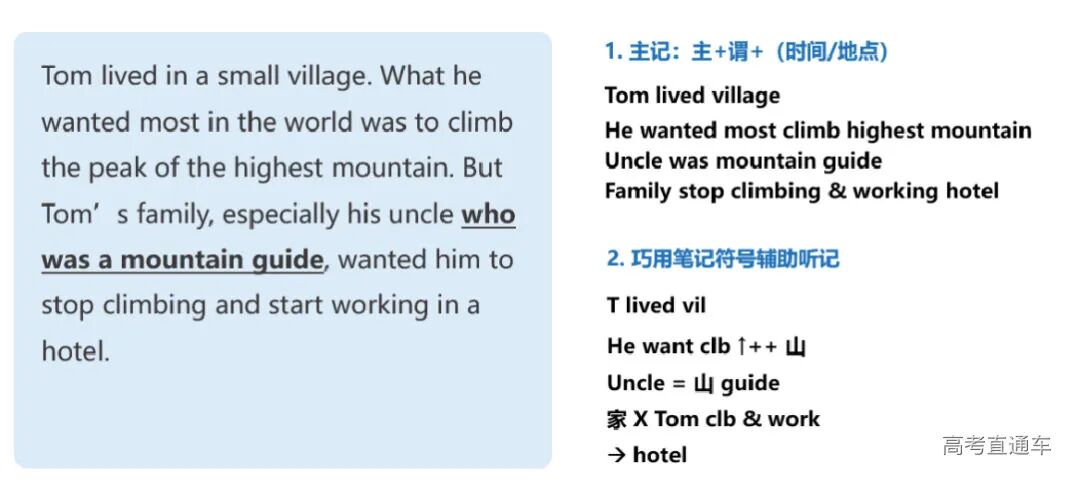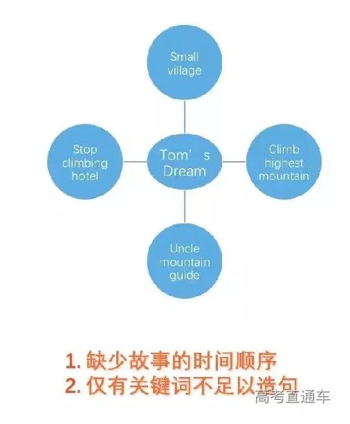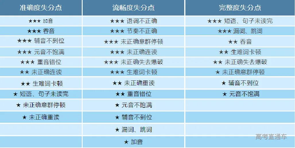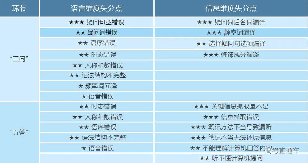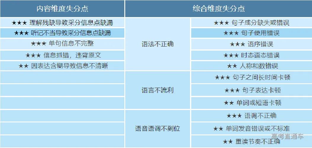 要求考生观看一段约一分钟的片段,然后考生开始模仿训练:先阅读文字稿,再对照文字稿听录音。 完成训练之后考生开始模仿朗读:考生对照片段的字幕朗读,要求考生的语音、语调和语速尽可能与片段保持一致。 录音前 1.播放第一遍录音 (1)序号打钩法:一个页面一个序号,没有生词就打钩。第一遍无需全文跟读,但要找到自己不会读的单词 (有生词或长单词,快速记下前几个字母,在一分钟读时至少读三遍熟悉) (遇到长句或者快速句时,记下最后1-2个单词,在一分钟准备时,借助其快速定位长难句并熟读,也可补充2-3词,以防到时读不完,可看记下的) 2.一分钟自由阅读练习(看情况选做) (1)熟读长难句,快速句补充最后一两词 (2)熟读生词和难词:写音标或谐音 (3)通读全文(读到多少算多少) 3. 播放第二遍录音 听发音,全文跟读。特别校对生词和难词的发音是否正确,快速核对音标。 4.正式录音前十秒空挡 继续读几遍生词,要完全熟悉,能下意识地读出来。 朗读技巧 发音: (1)每个单词发音饱满,不要漏掉尾音,尤其是复数名词和过去式 (2)匀速——带a、the和of等的结构,不要读太快,以防这些音没被收进去 (3)高分技巧:语调要有轻重地朗读,音量尽量大声 失分点 模仿朗读题型的评分主要分为三个维度:准确度、流畅度、完整度。根据评分维度,下表列出了各个维度失分的失分点。 听完录音之后首先根据中文提示,准备20秒钟后用英语提出三个问题,计算机将回答考生的提问;然后计算机向考生提出五个问题,考生必须根据自己所听的内容(包括音频和计算机的回答两部分)回答问题,回答问题之前考生有10秒钟的准备时间。 高分技巧 (1)可利用回答空档再次熟悉笔记,预判问题 失分点 角色扮演题型的评分主要分为两个维度:语言维度、信息维度。根据评分维度,下表列出了各个维度失分的失分点。 要求考生先听一段大约两分钟的独白,录音播放两遍。考生准备一分钟之后开始复述所听到的内容。要求考生尽可能使用自己的语言复述,而且复述内容应涵盖尽可能多的原文信息点。选取的独白其体裁主要以记叙文和议论文为主。 高分技巧 (1)发音要像part A一样饱满大声,不要因为紧张读快,不要停顿 失分点 故事复述题型的评分主要分为两个维度:内容维度和综合维度。下表根据不同环节和评分维度,列出了各个维度的高频失分点。 导致失分的三个最重要的因素为:信息要点缺失、逻辑篇章结构混乱、人称时态混乱。 什么是信息要点? 如何记录信息要点? 故事复述—笔记技巧: 故事复述—听记方案: