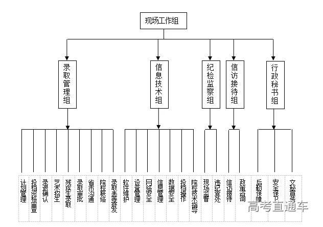 行政秘书组:负责录取场地的安排和安全保卫;为录取工作提供后勤保障;负责协助领导小组做好相关协调工作;负责招生录取宣传和舆情监控等工作。