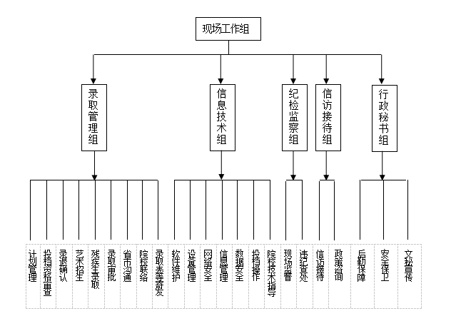 2.录取现场指导监督小组。在录取工作领导小组的领导下,主要负责协调、督促录取现场各部门、各环节工作的正常运转,全程跟踪、监控每一个流程的工作;负责工作运转中重大事项的决定和异常情况的处理,研究处理录取过程中出现的紧急情况。