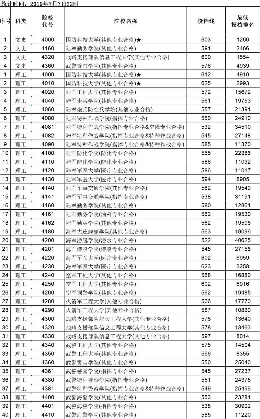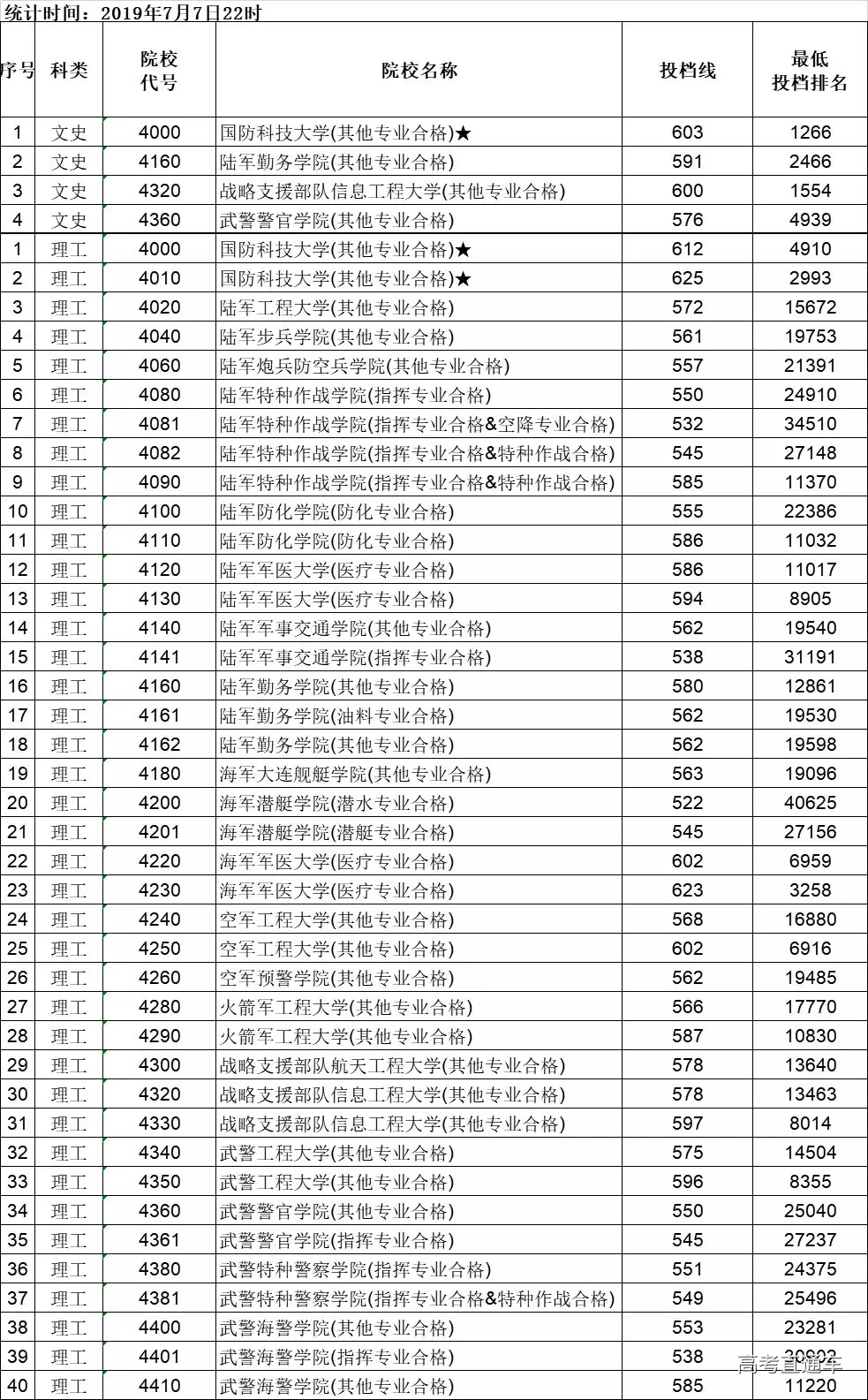 参加提前批本科军事类院校理工类录取的院校40所,投档分数居前的院校为: