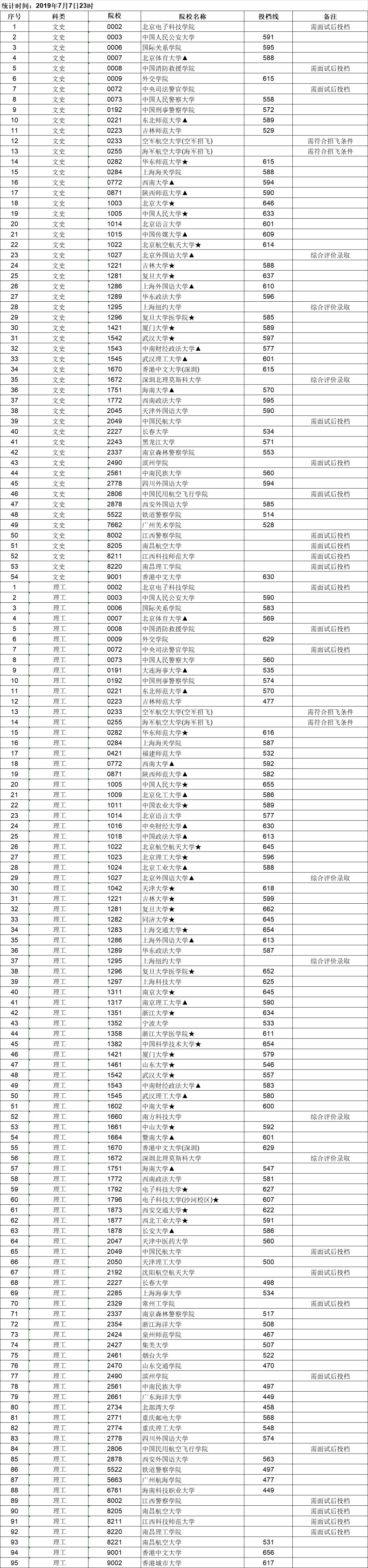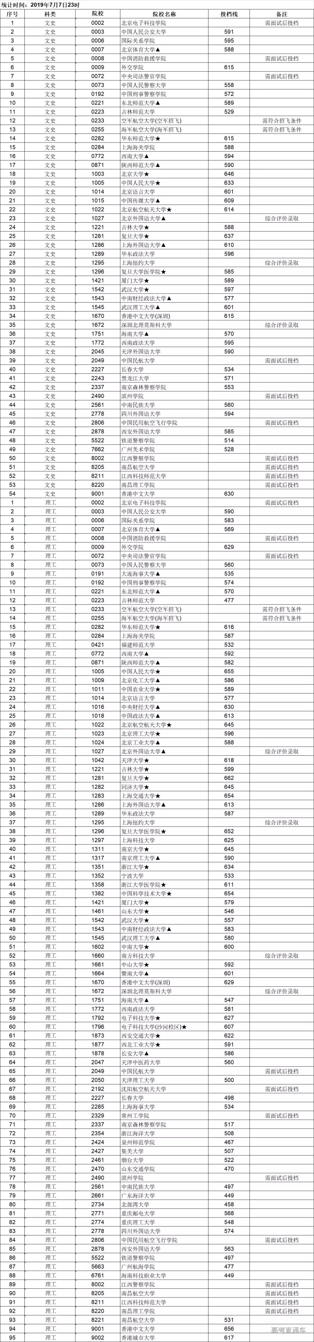 参加提前批本科非军事类院校理工类录取的院校共有95所,投档分数居前的院校为: