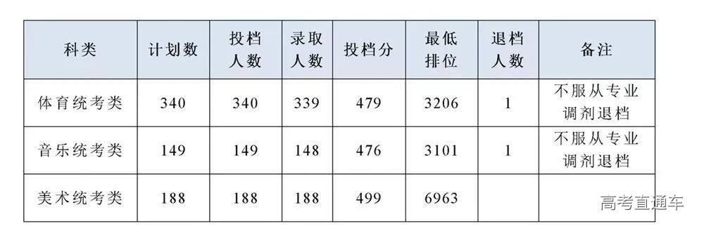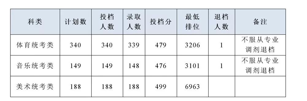 注明:根据学校招生章程,我校本科批艺术体育类统考录取规则:根据各省投档规则出档后,按“分数优先,遵循志愿”原则录取。学校对投出档案考生的文化课成绩和术科成绩按一定比例计算后得出综合分,按照综合分由高到低的顺序,优先安排高分考生的第一专业志愿,若该专业额满,再逐一查看该生的后续专业志愿。若考生专业填报顺序和综合分都相同时,则专业术科分高者优先录取。 学校认可所在省统考成绩的体育类及艺术类专业:综合分=高考文化课成绩×30%+术科统考成绩×(750/生源省术科统考满分)×70%。 现将我校艺术体育统考类投档录取情况公布如下: