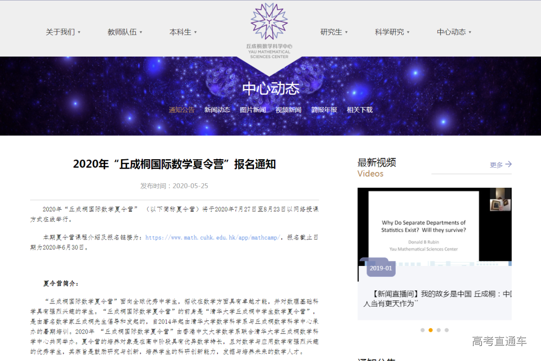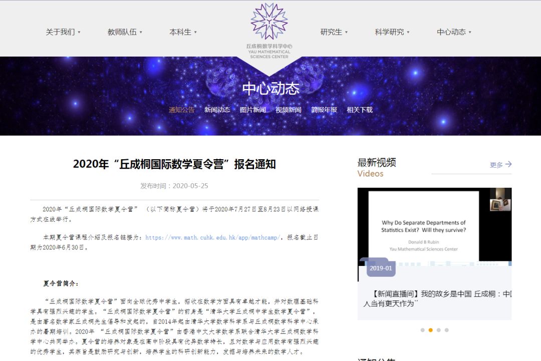 今天,清华丘成桐数学科学中心发布2020年“丘成桐国际数学夏令营”报名通知。和往年相比,今年的丘成桐夏令营由香港中文大学数学系联合清华大学丘成桐数学科学中心共同举办,并以网络授课方式在线举行。
