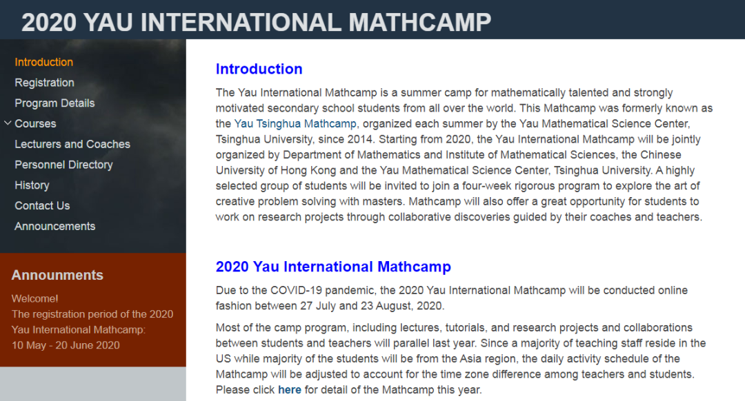 “丘成桐国际数学夏令营”面向全球优秀中学生,招收在数学方面具有卓越才能,并对数理基础科学具有强烈兴趣的学生。“丘成桐国际数学夏令营”的前身是“清华大学丘成桐中学生数学夏令营”,是由著名数学家丘成桐先生倡导和发起的,自2014年起由清华大学数学科学系与丘成桐数学科学中心承办的暑期培训。2020年 “丘成桐国际数学夏令营”由香港中文大学数学系联合清华大学丘成桐数学科学中心共同举办。夏令营的培养对象是在高中阶段具有优异数学特长,且对数学与应用数学有强烈兴趣的优秀学生,其宗旨是鼓励研究与创新,培养学生的科研创新能力,发掘与培养未来的数学人才。