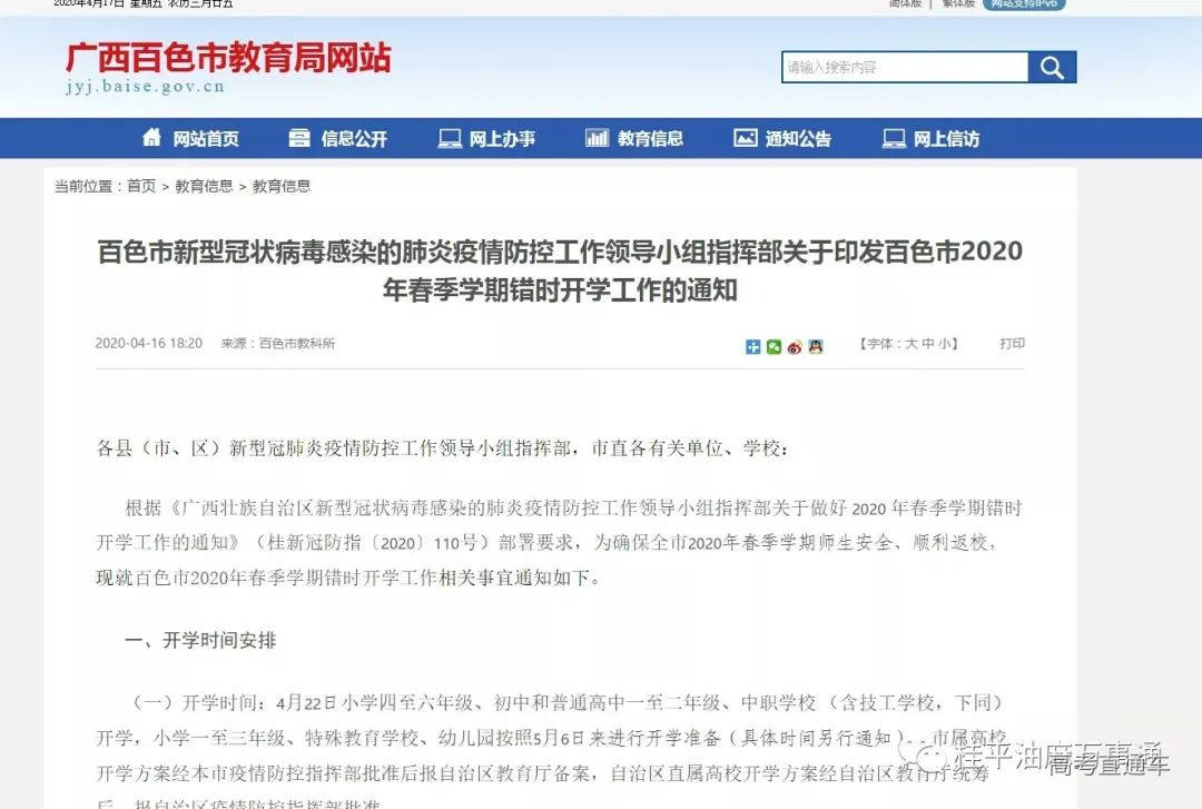 4月15日,百色市新冠肺炎疫情防控指挥部印发《百色市新型冠状病毒感染的肺炎疫情防控工作领导小组指挥部关于印发百色市2020年春季学期错时开学工作的通知》(百新冠防指办〔2020〕75号),公布百色市中小学2020年春季学期开学时间安排。