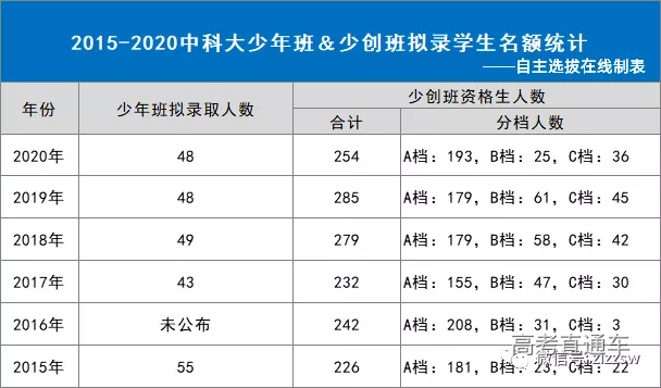 2015-2020中科大少年班、少创班拟录取学生名额统计表